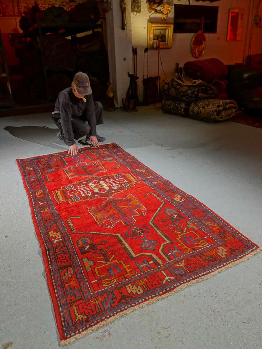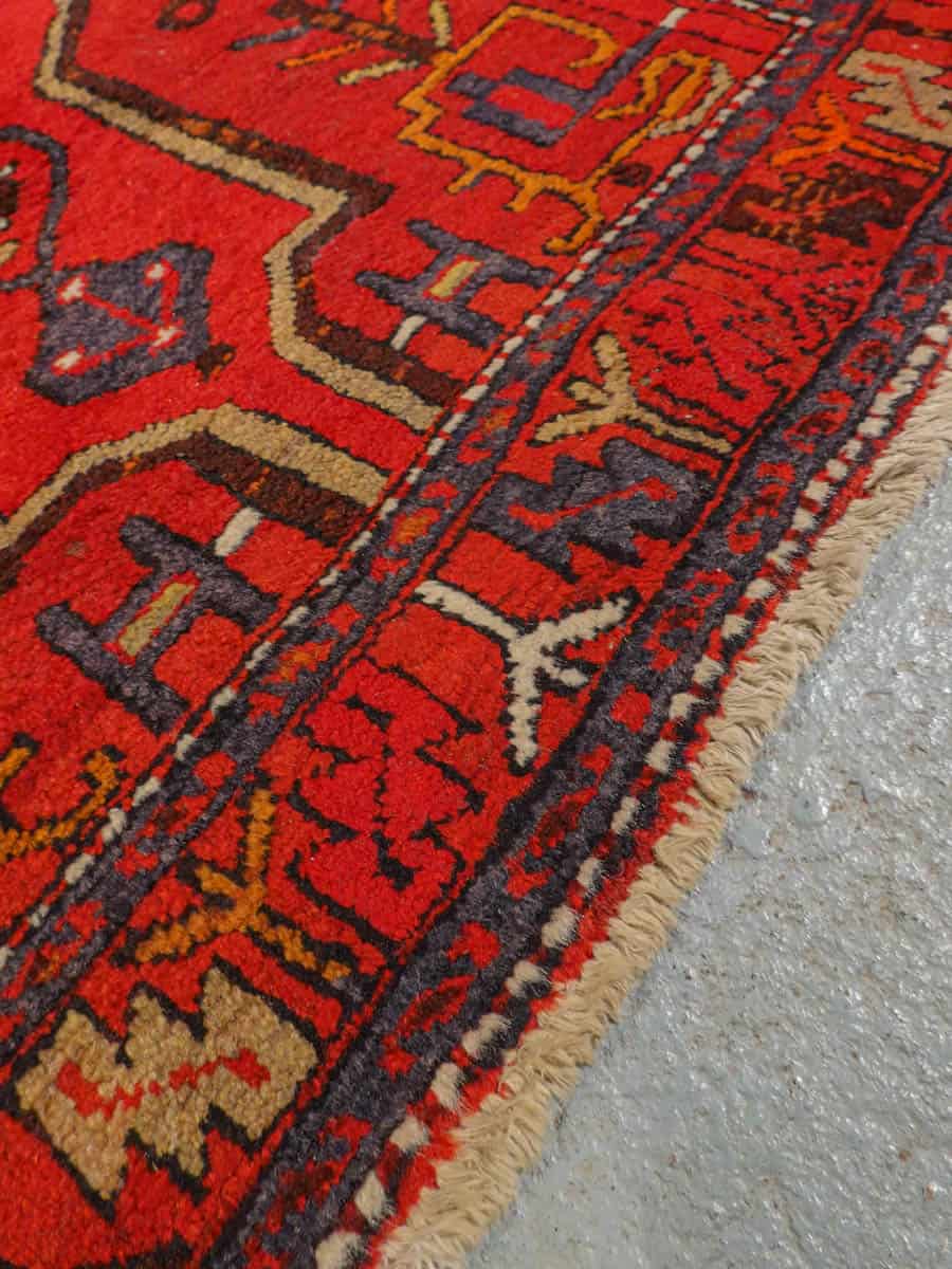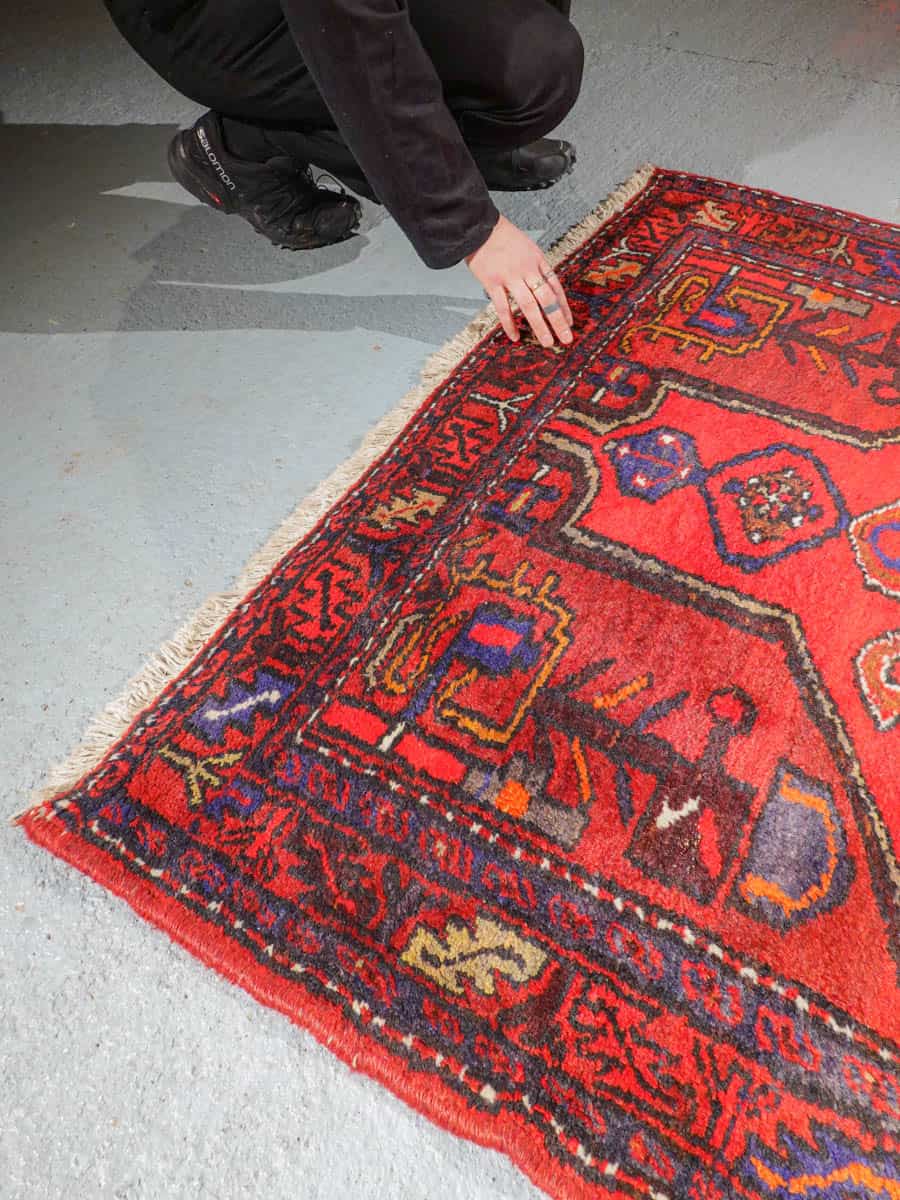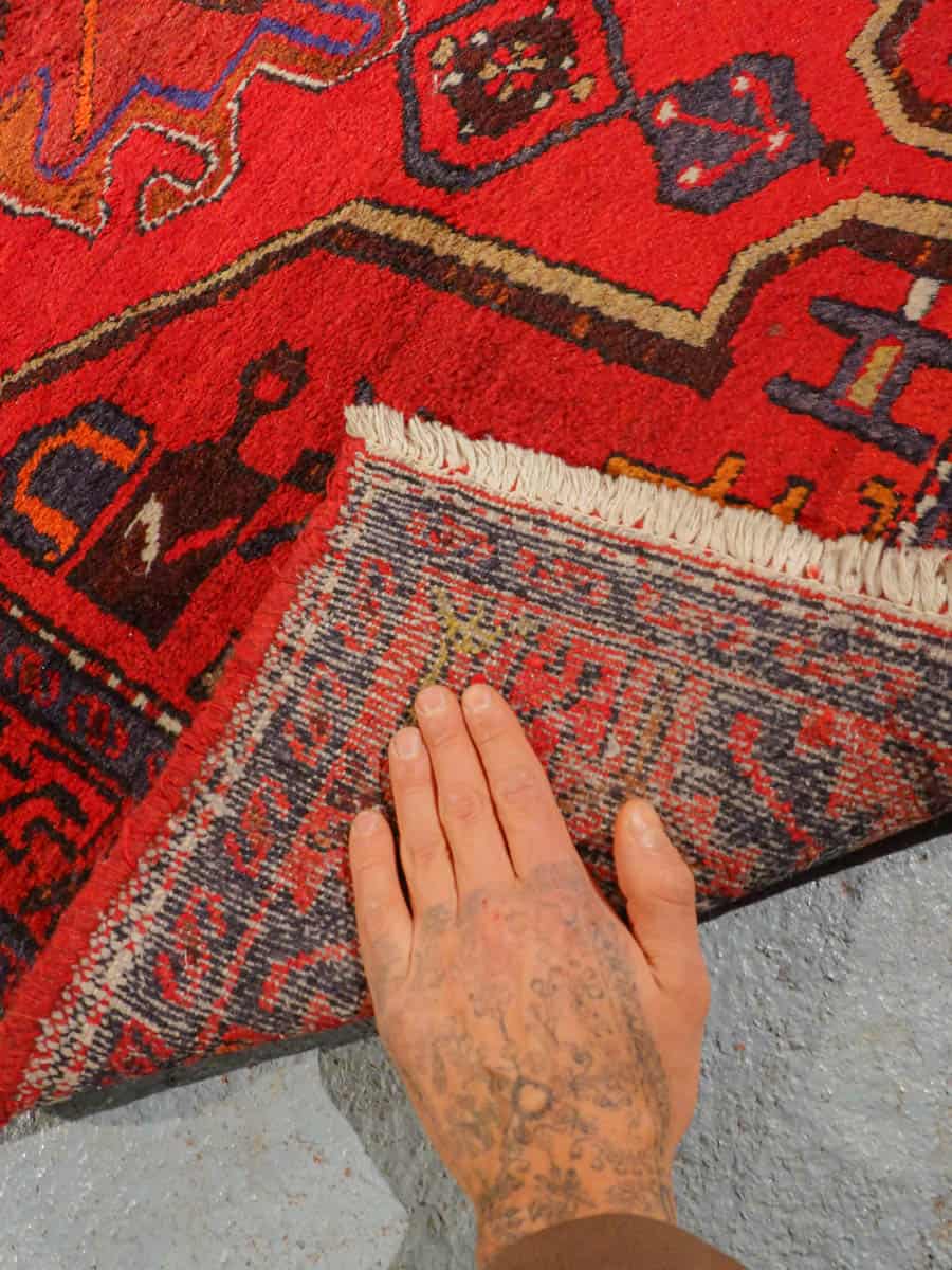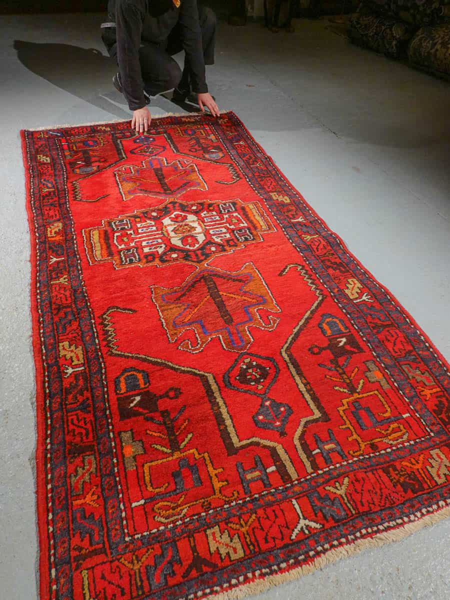 Upea Hamadan kirkkaana säilyneenä punasella pohjalla ja tyylikkäillä geometrisilla kuvioilla..