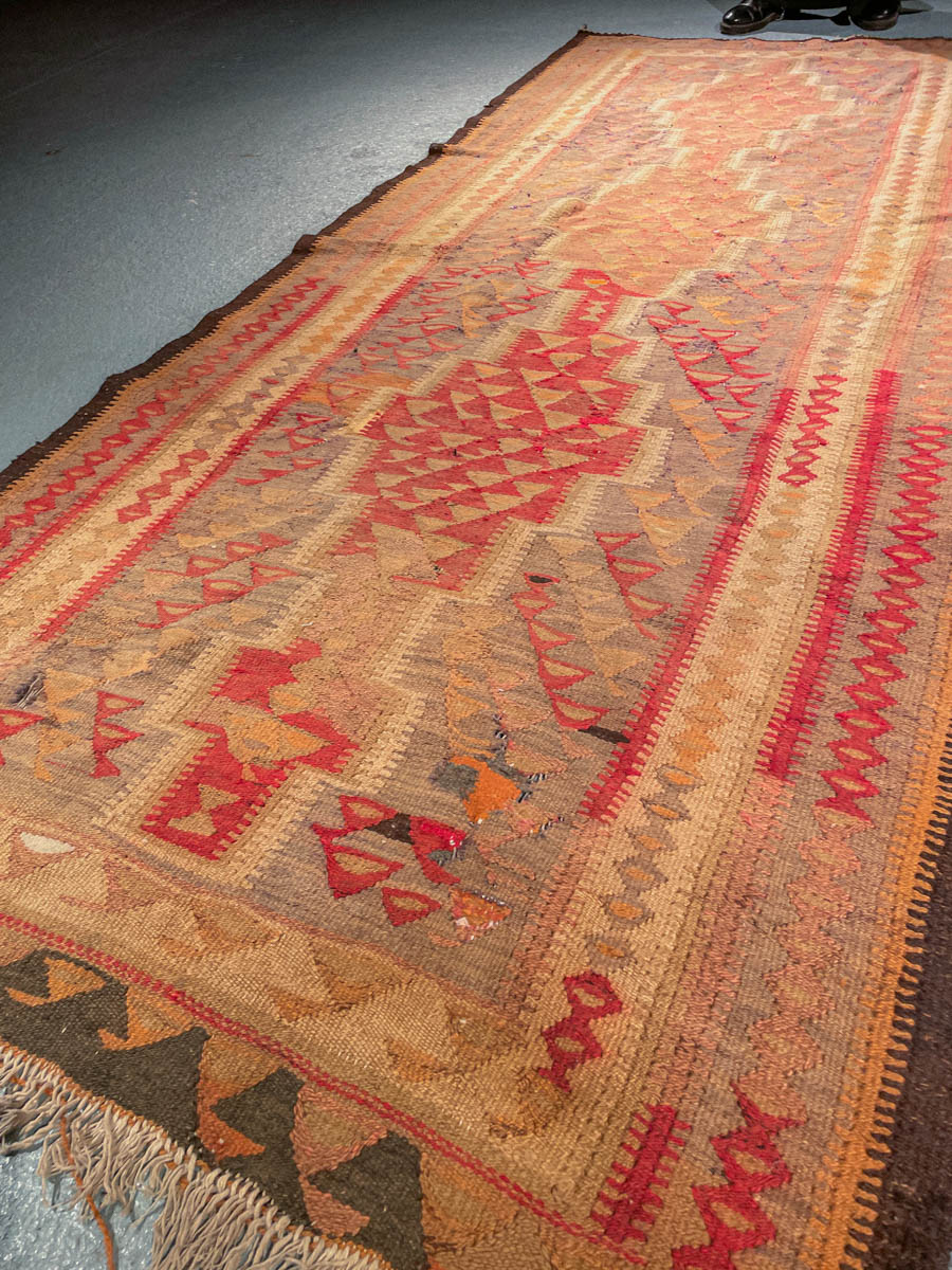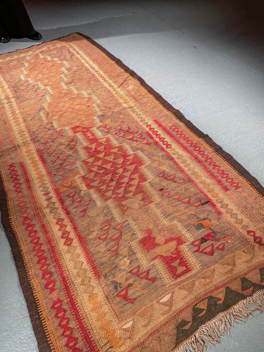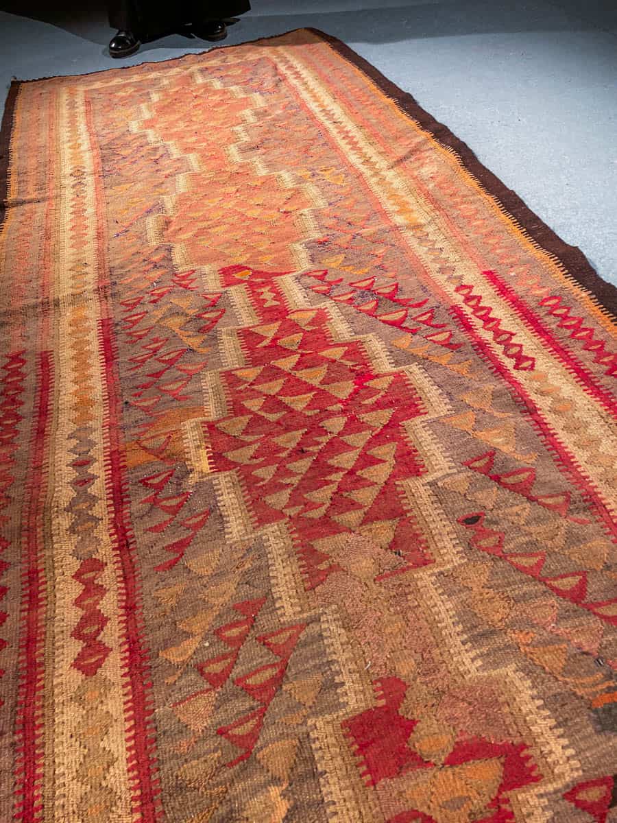 Historiaa huokuva Kelim-käytävämatto geometrisellä kuvioinnilla ja lämpimällä väriteemalla. Kudottu villasta n. 60 vuotta sitten.