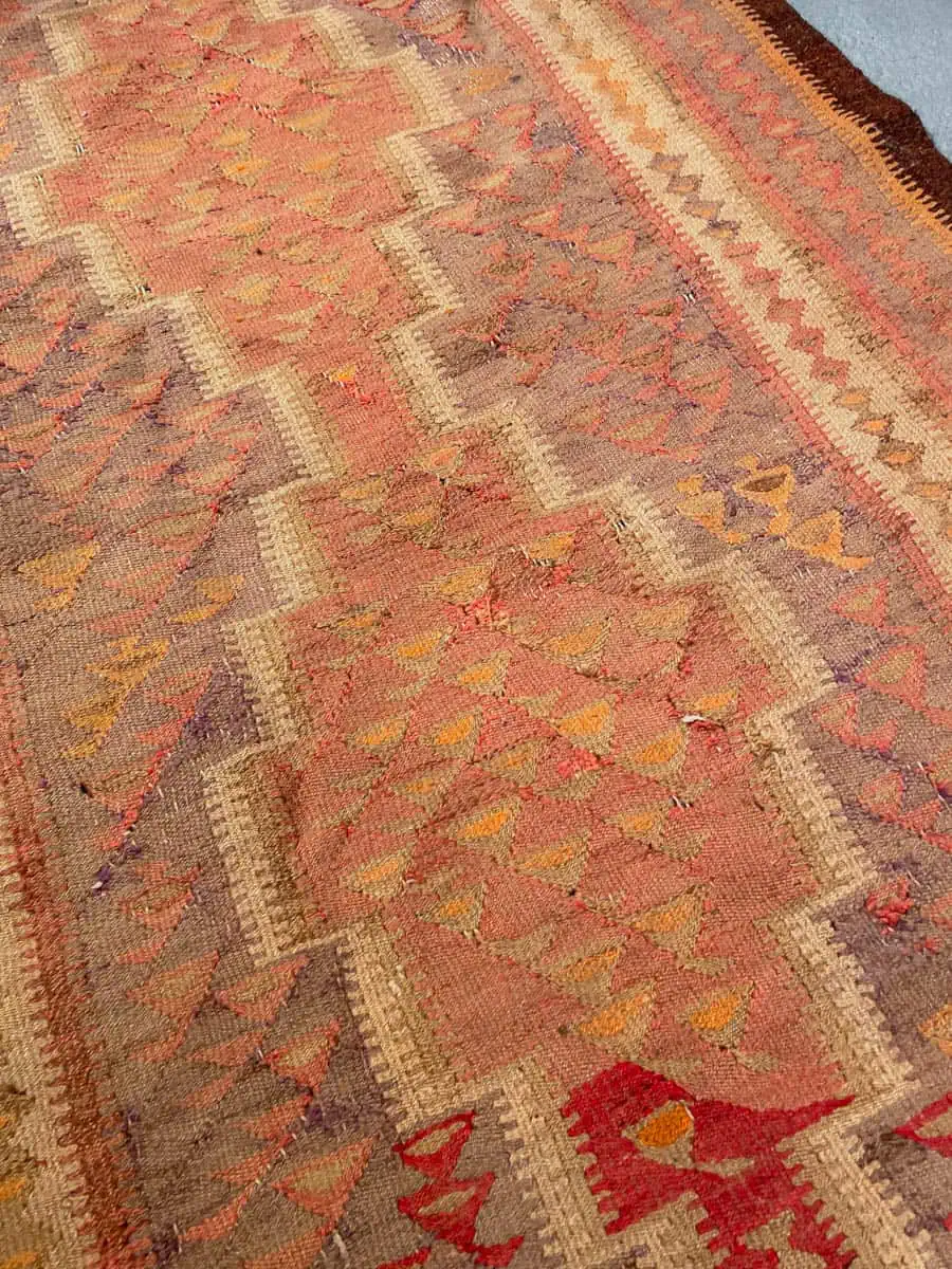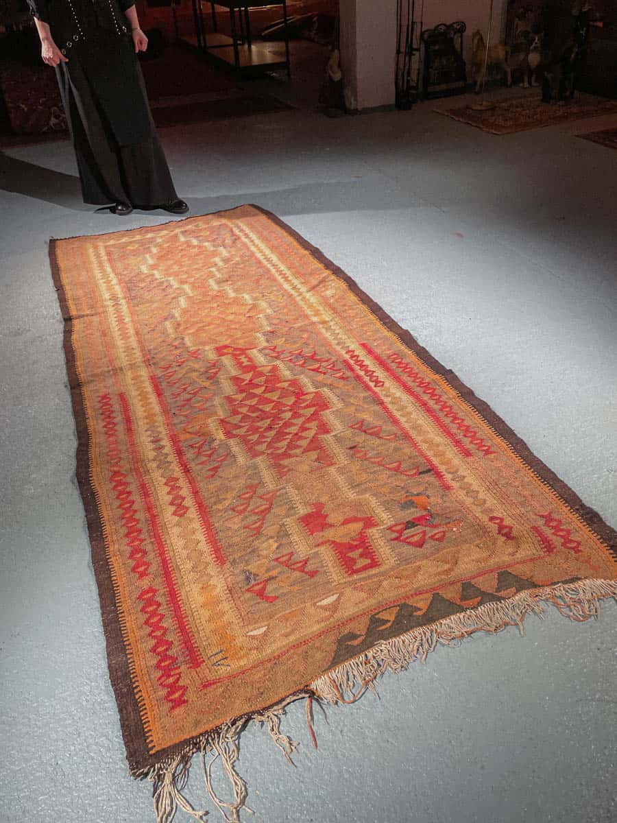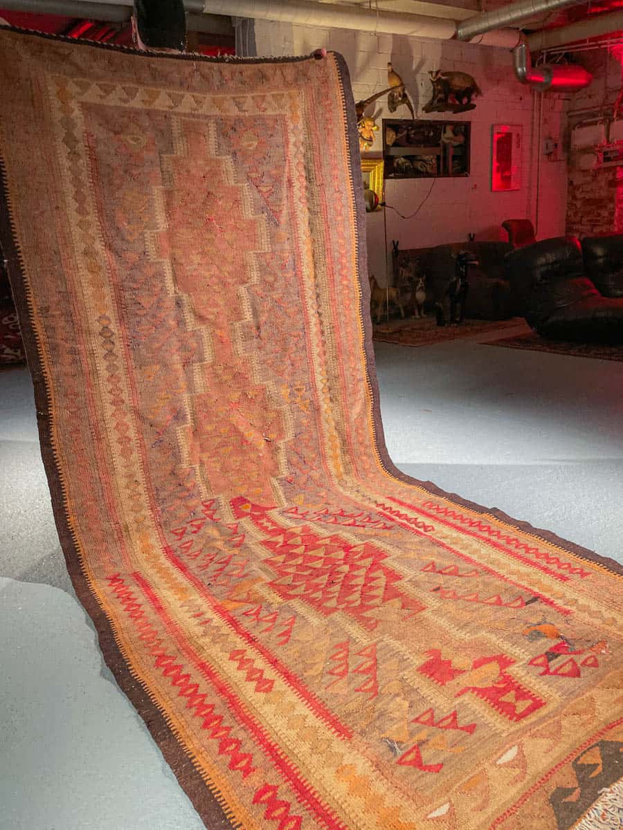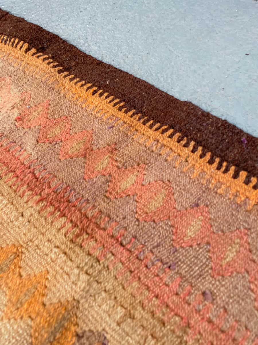 Historiaa huokuva Kelim-käytävämatto geometrisellä kuvioinnilla ja lämpimällä väriteemalla. Kudottu villasta n. 60 vuotta sitten.