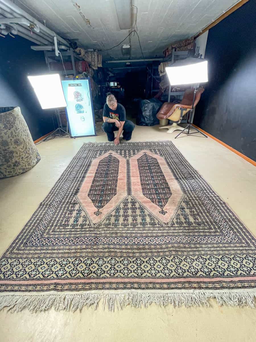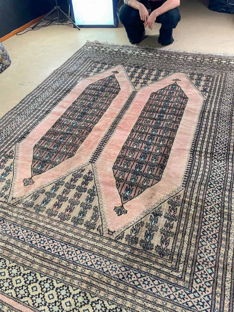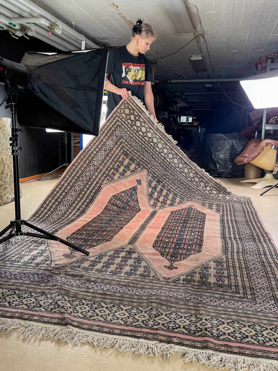 Tämä matto sijaitsee Töölön varastollamme – jos haluat tulla katsomaan sitä paikan päälle, sovithan näytön viestitse tai puhelimitse.