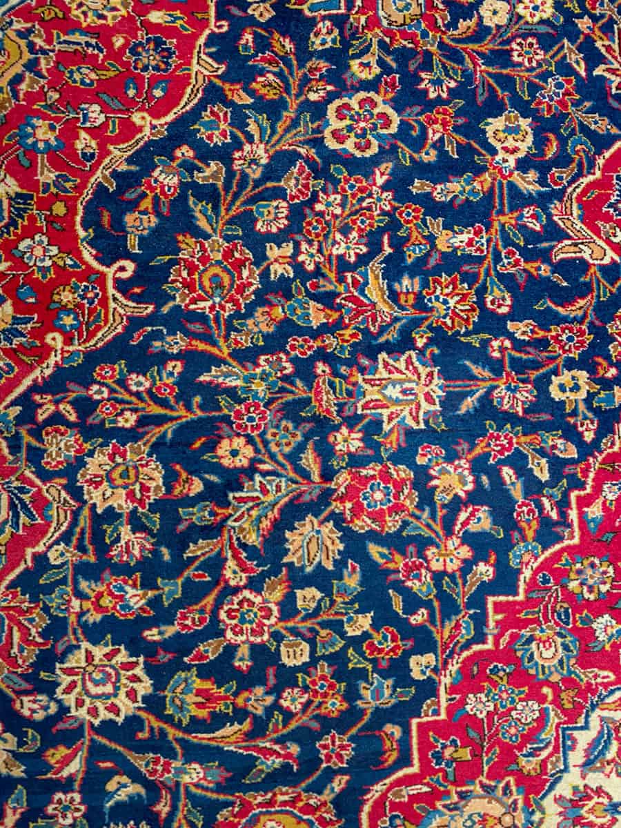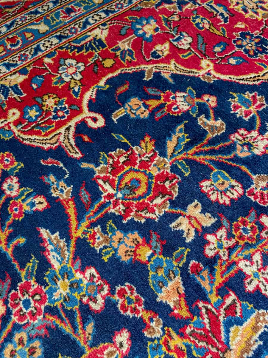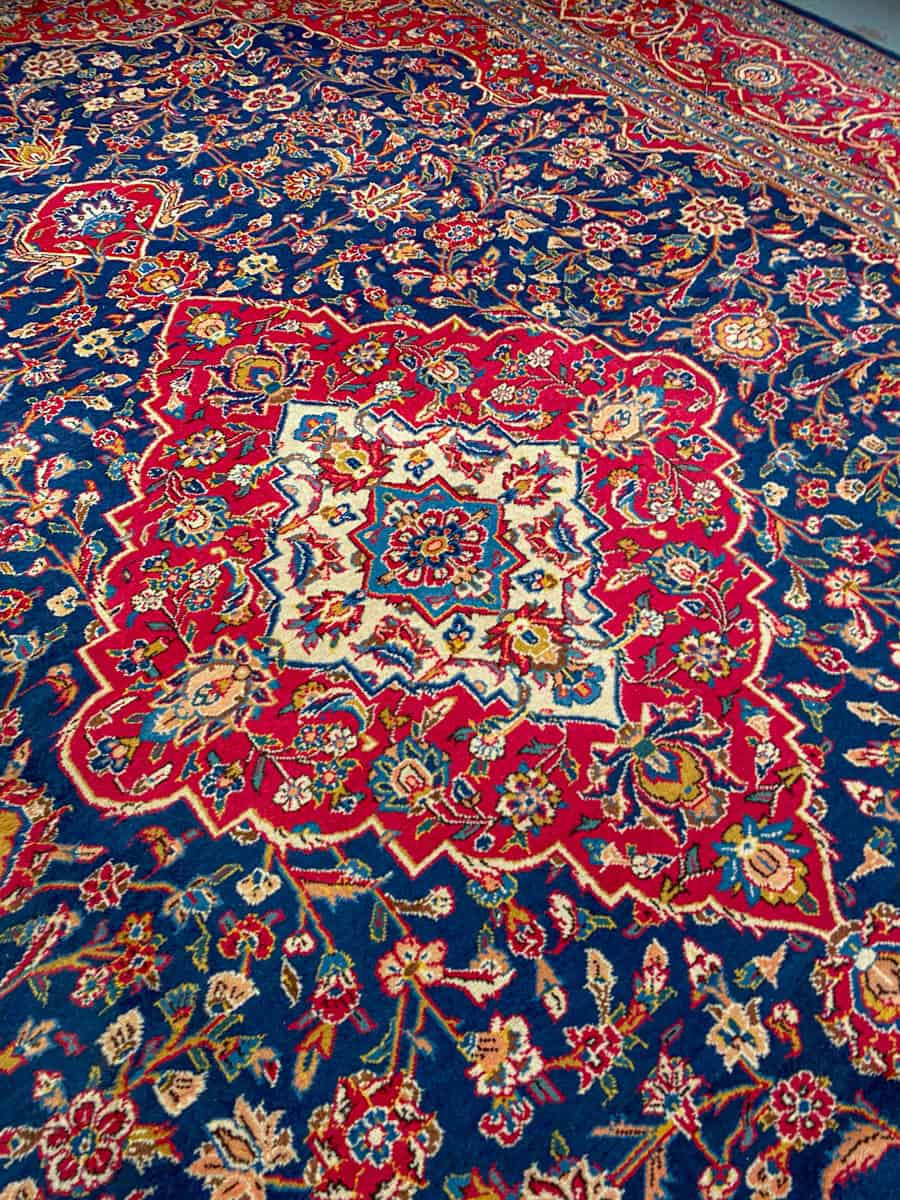 Tyrmäävä ja yksityiskohtainen perinteinen iranilainen Keshan-villamatto upean kirkkaalla sinipunaisella väriteemalla. Koristeellinen keskimedaljonki.