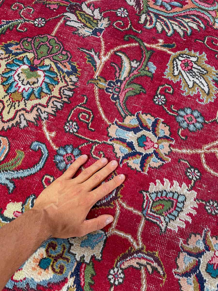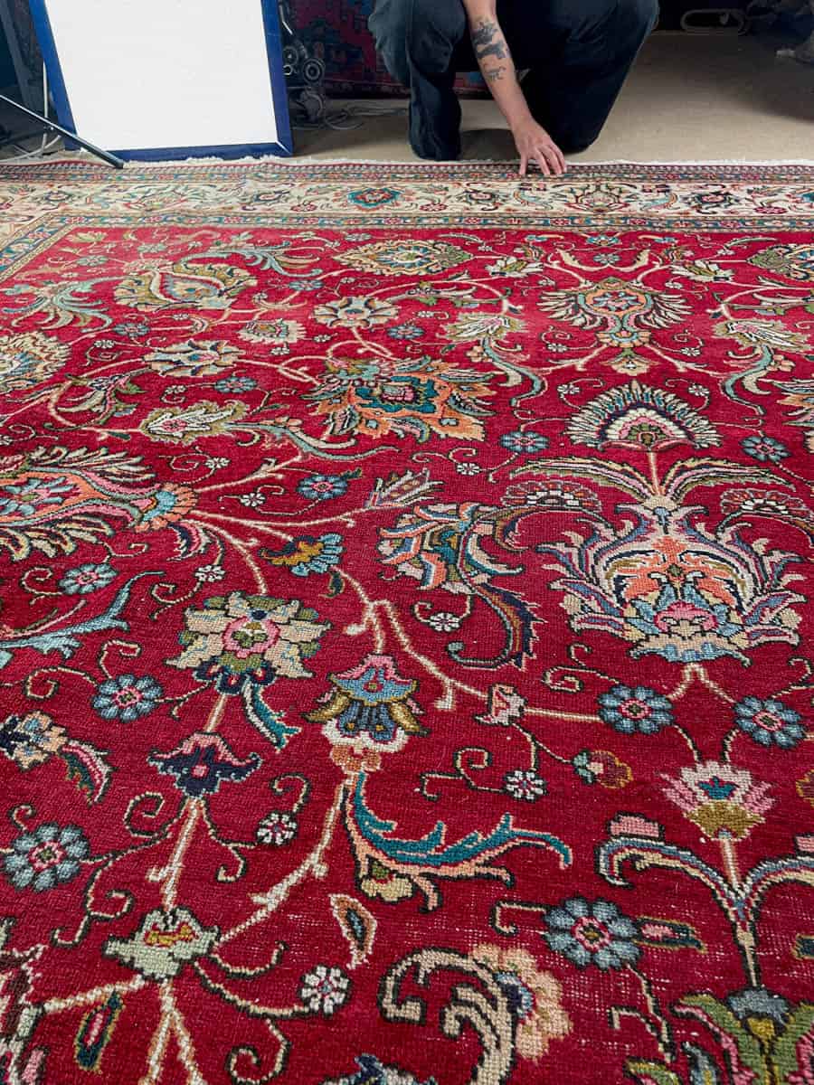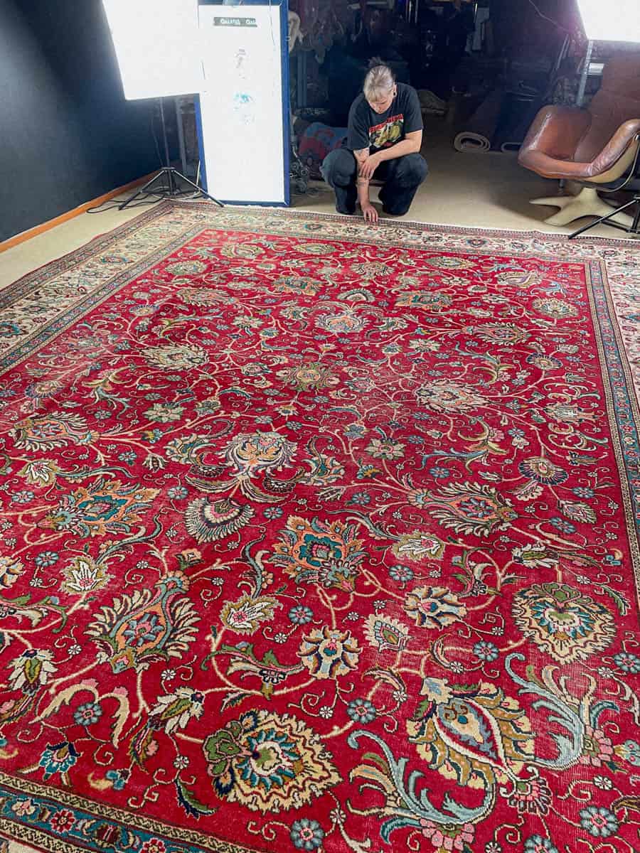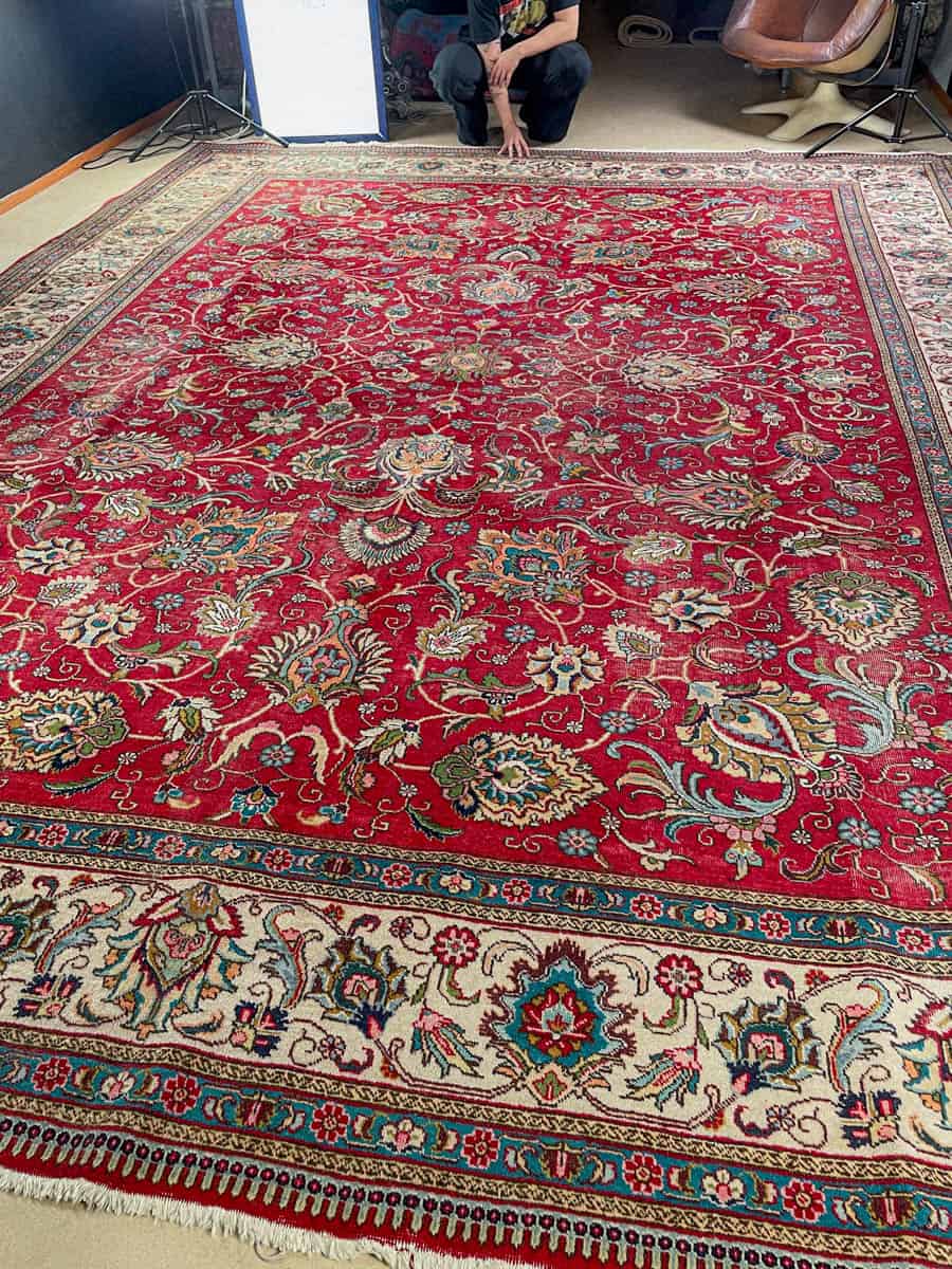 Tämä matto sijaitsee Töölön varastollamme – jos haluat tulla katsomaan sitä paikan päälle, sovithan näytön viestitse tai puhelimitse.