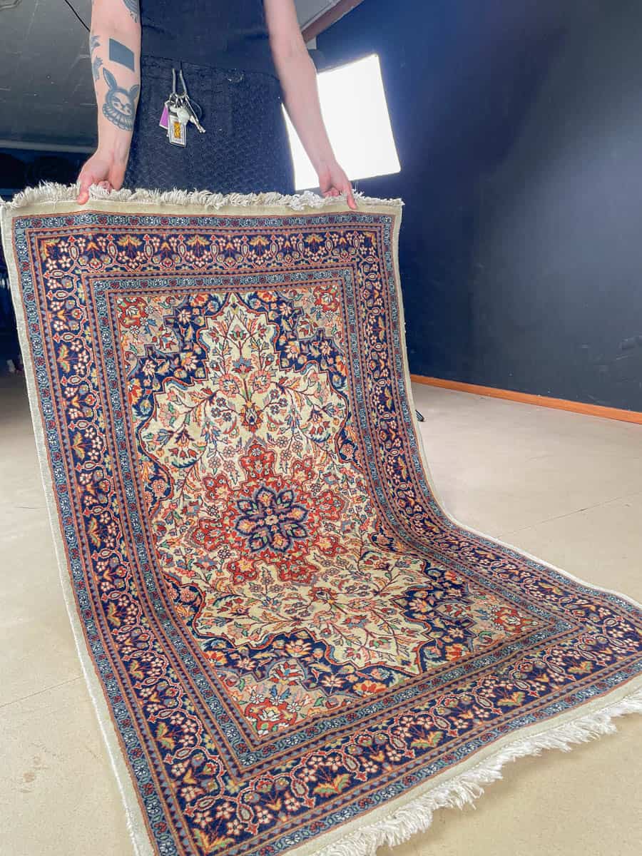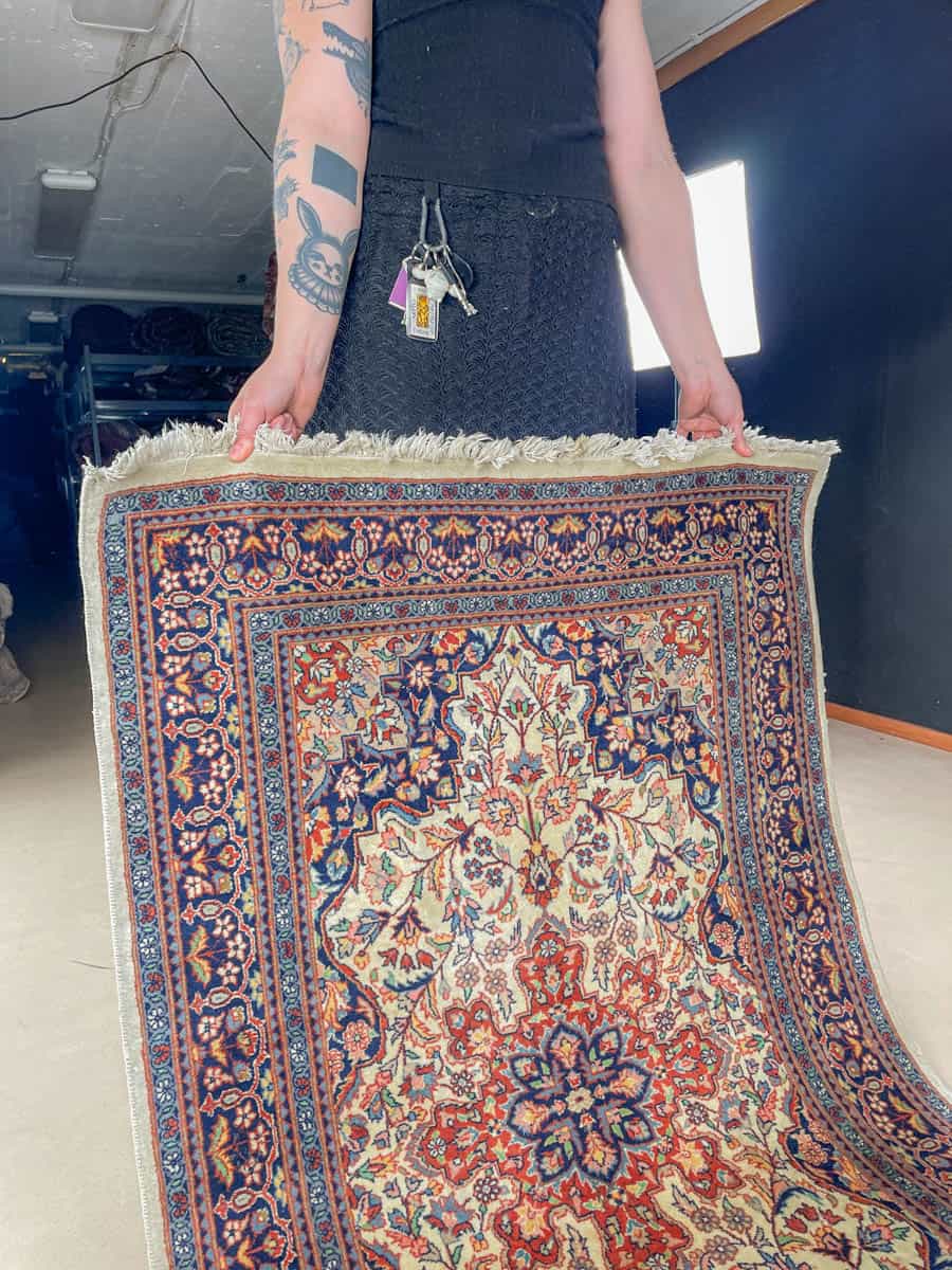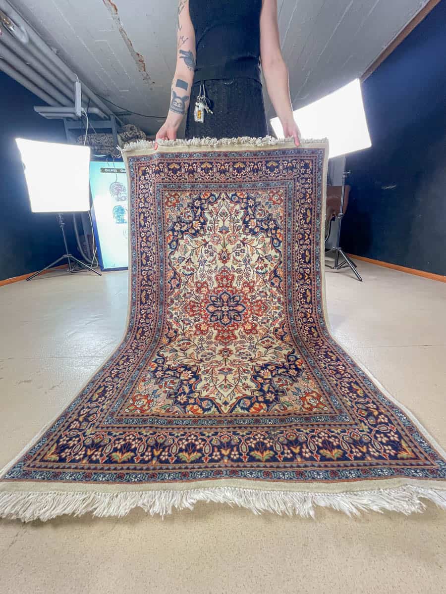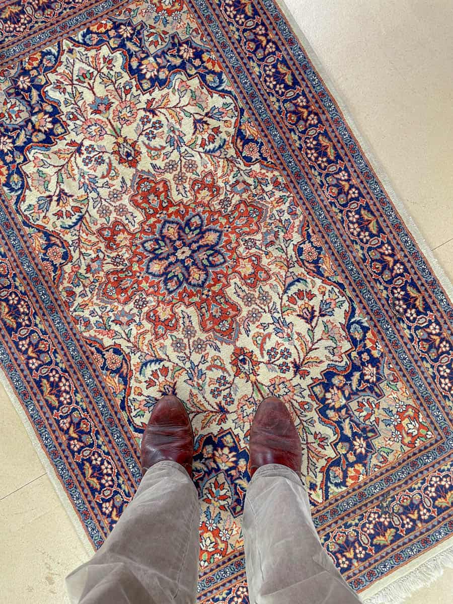 Tämä matto sijaitsee Galleriallamme osoitteessa Kankurinkatu 7, Punavuori – jos haluat tulla katsomaan sitä paikan päälle, sovithan näytön viestitse tai puhelimitse.