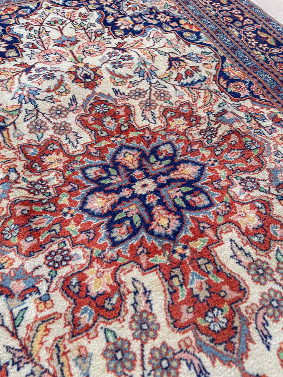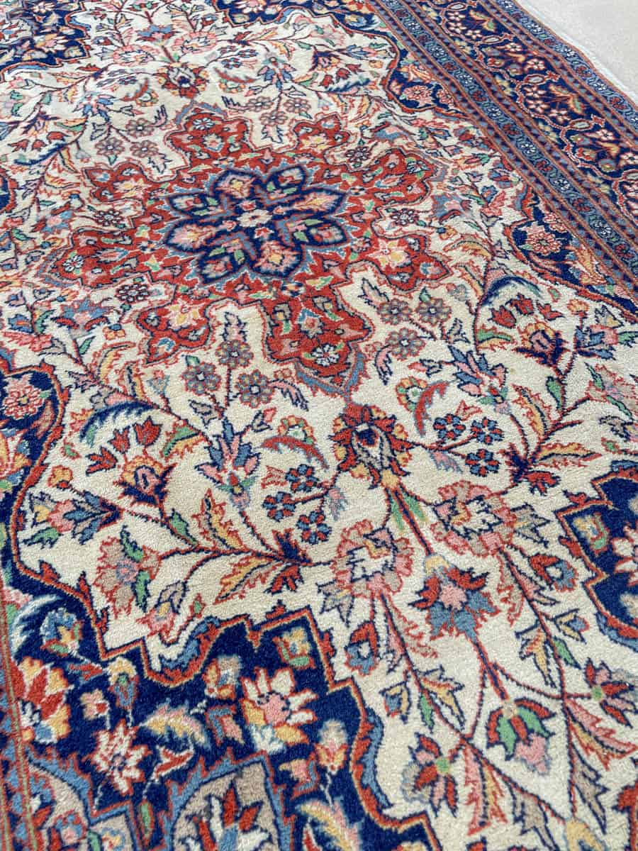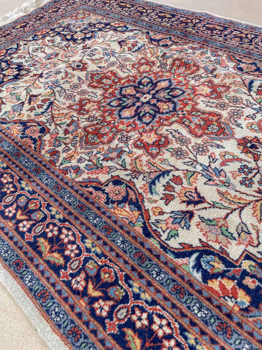 Upean hyväkuntoinen ja elegantin värinen Ghom, jonka kermanväriselle pohjalle levittäytyy runsas ornamenttikuviointi. Hämmästyttävän yksityiskohtainen solmutiheys.