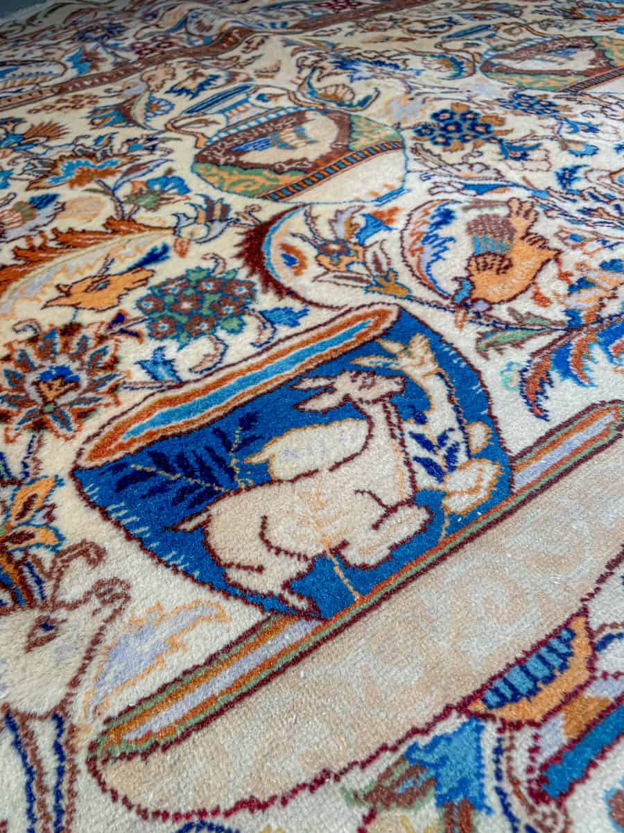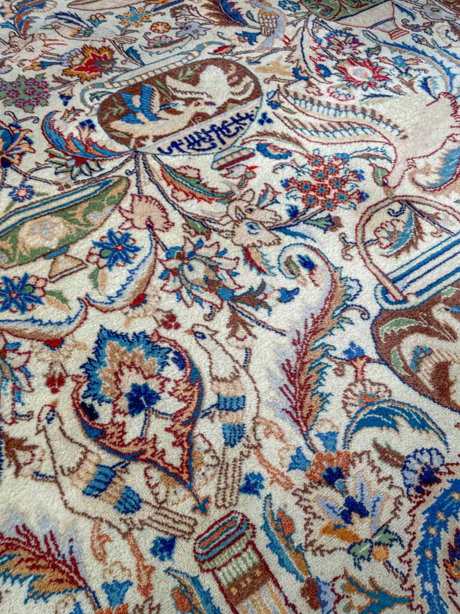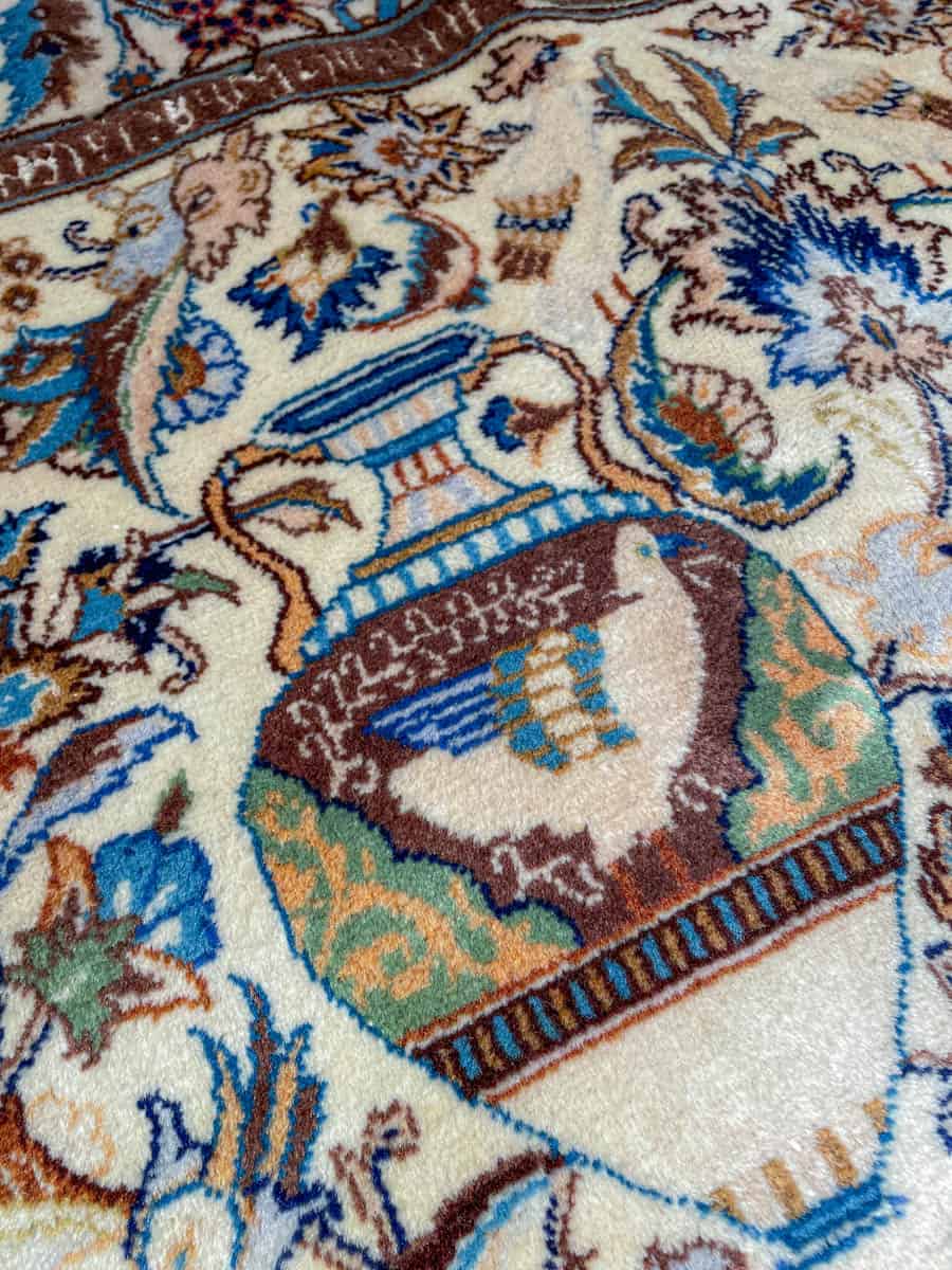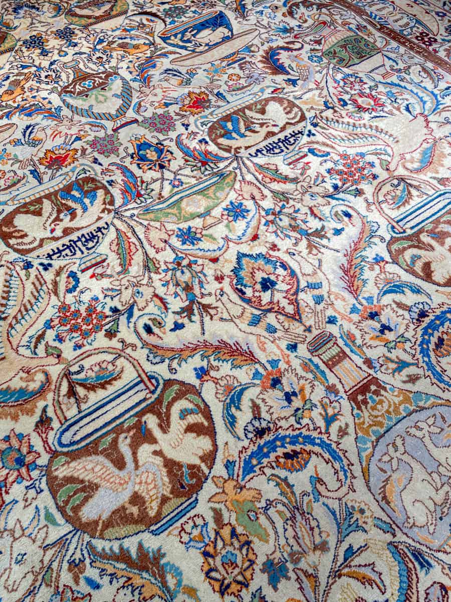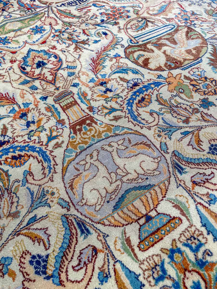 Juhlallisen koristeellinen vaalea Kashmar uskomattoman yksityiskohtaisella kuvioinnilla. Kuvioinnista löytyy perinteiseen Kashmar-tyyliin rönsyilevä kokonaisuus vaaseja, eläimiä ja kasvillisuutta.