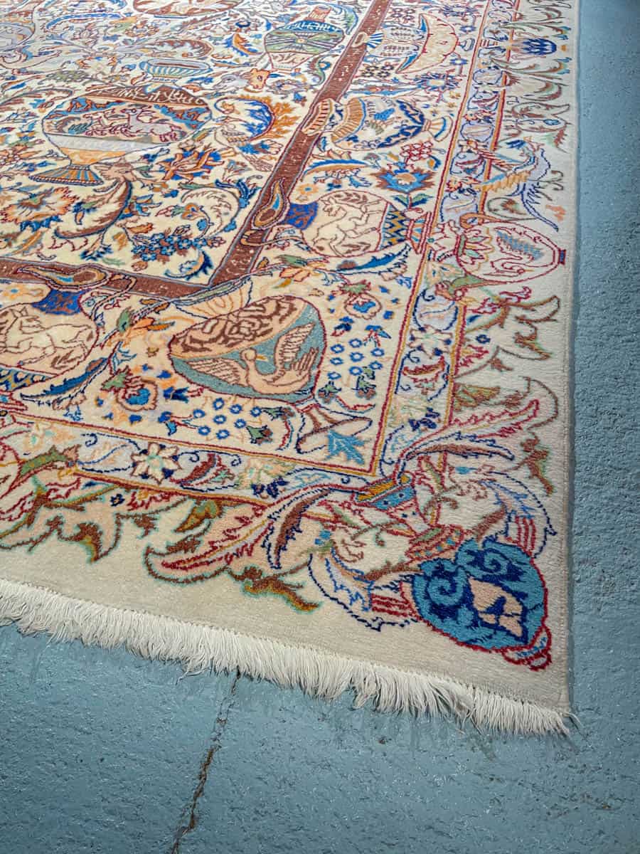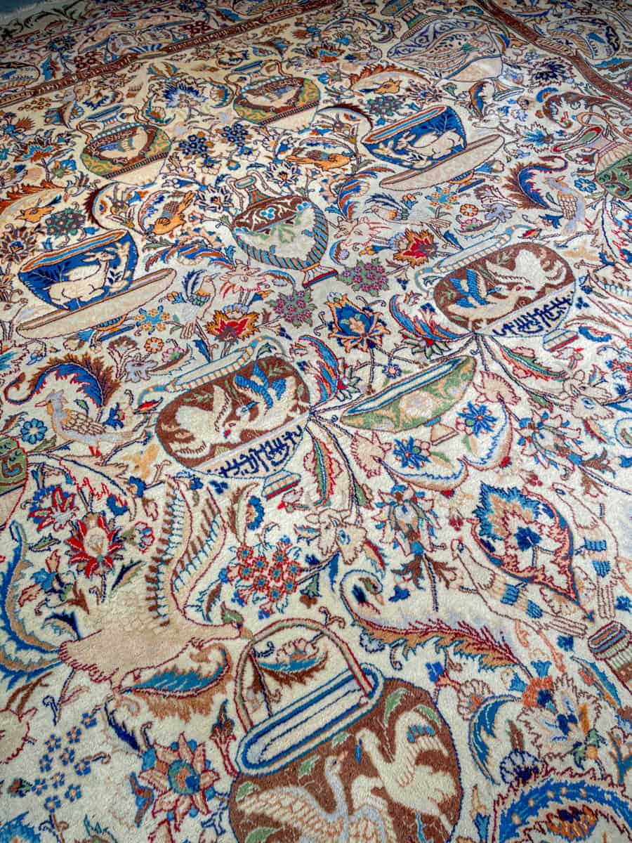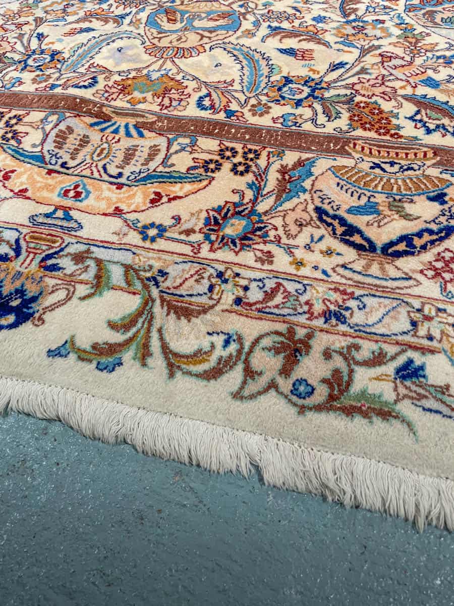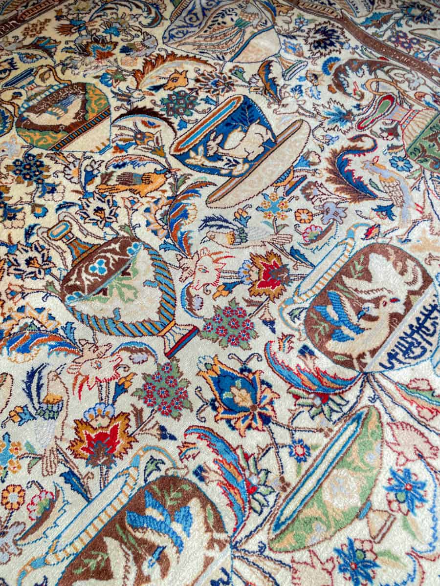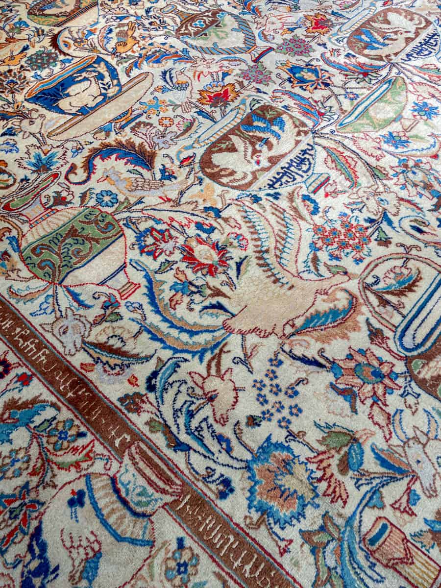 Juhlallisen koristeellinen vaalea Kashmar uskomattoman yksityiskohtaisella kuvioinnilla. Kuvioinnista löytyy perinteiseen Kashmar-tyyliin rönsyilevä kokonaisuus vaaseja, eläimiä ja kasvillisuutta.