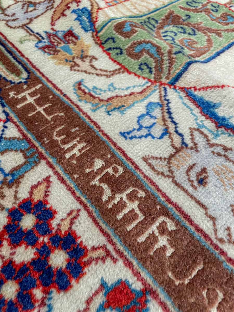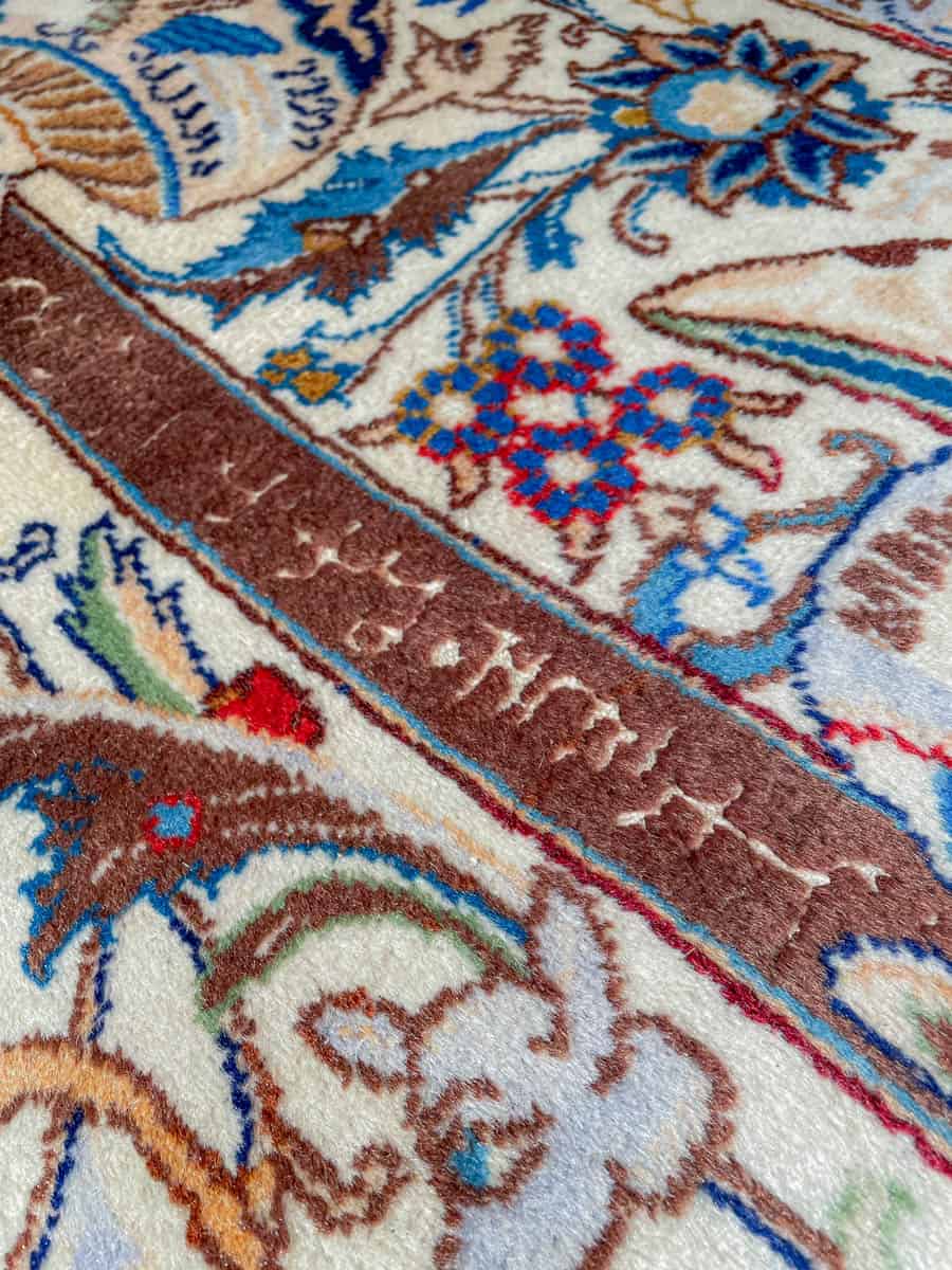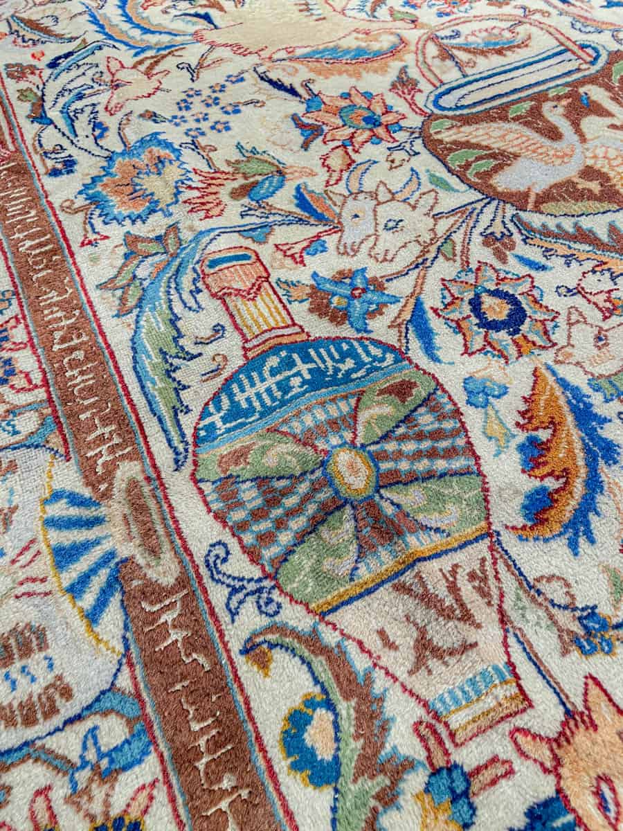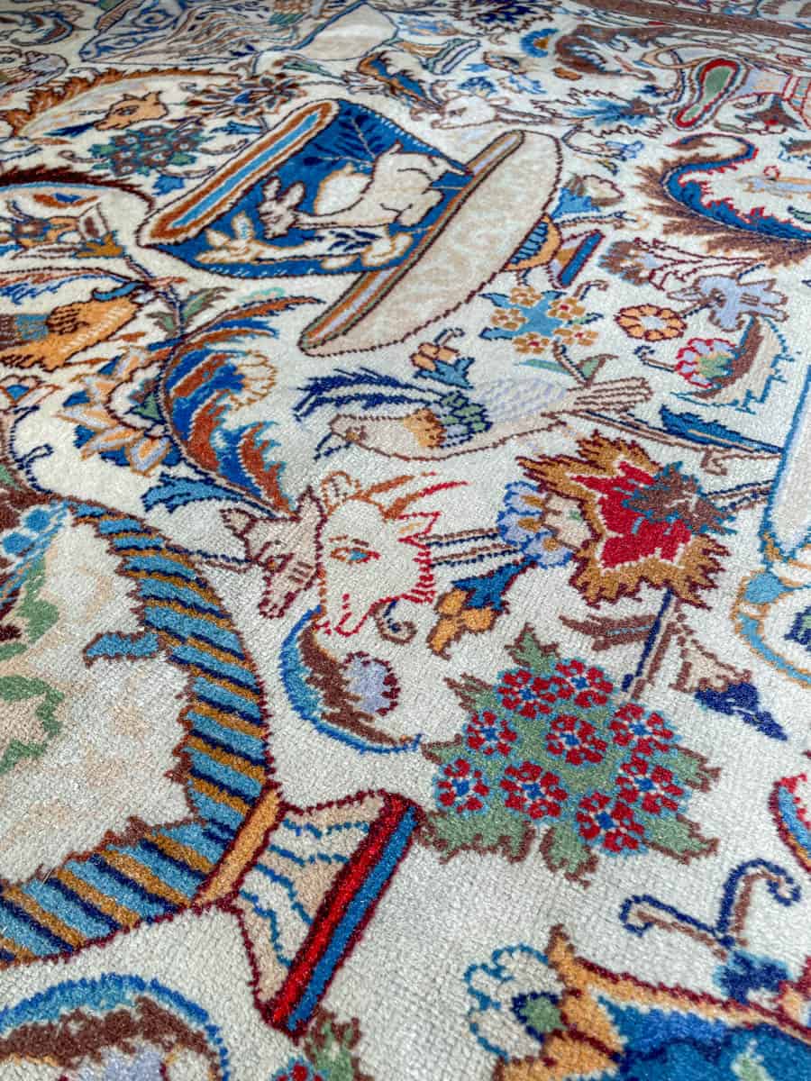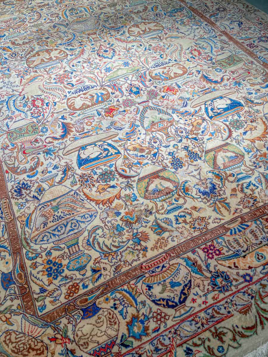 Juhlallisen koristeellinen vaalea Kashmar uskomattoman yksityiskohtaisella kuvioinnilla. Kuvioinnista löytyy perinteiseen Kashmar-tyyliin rönsyilevä kokonaisuus vaaseja, eläimiä ja kasvillisuutta.