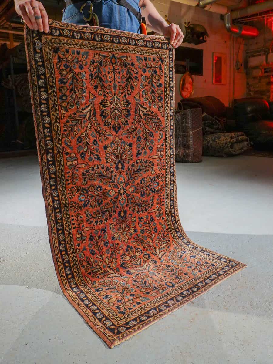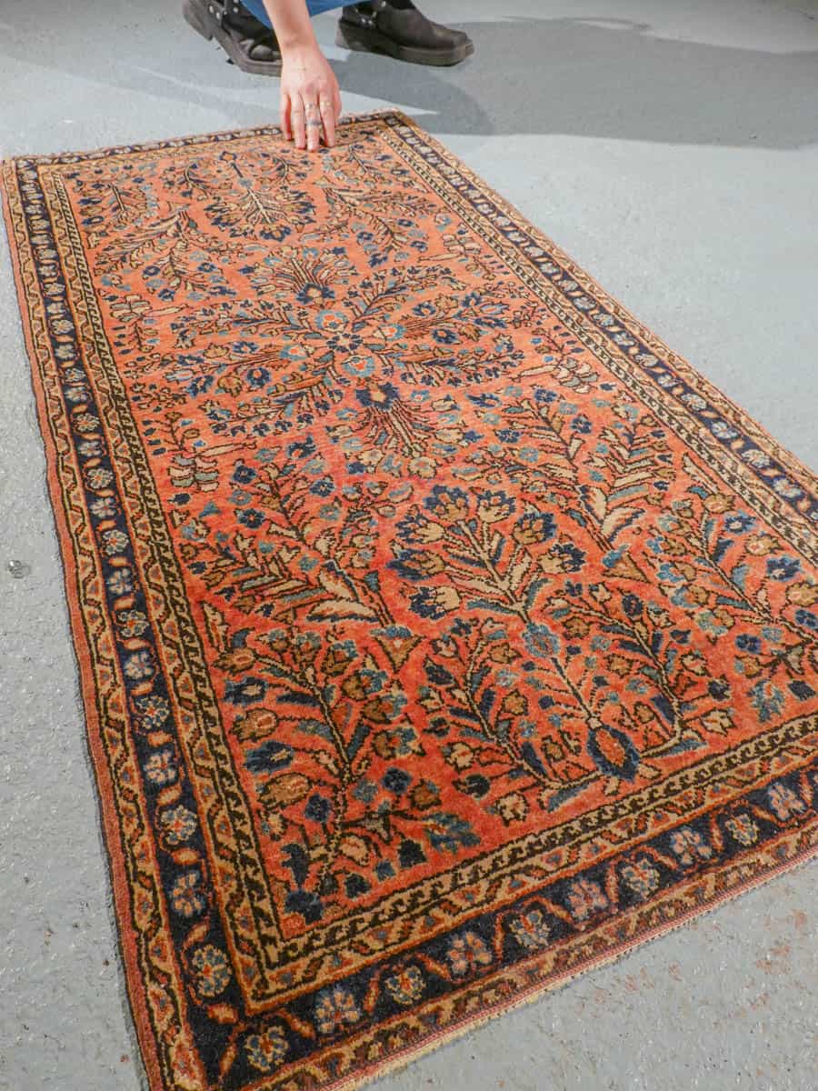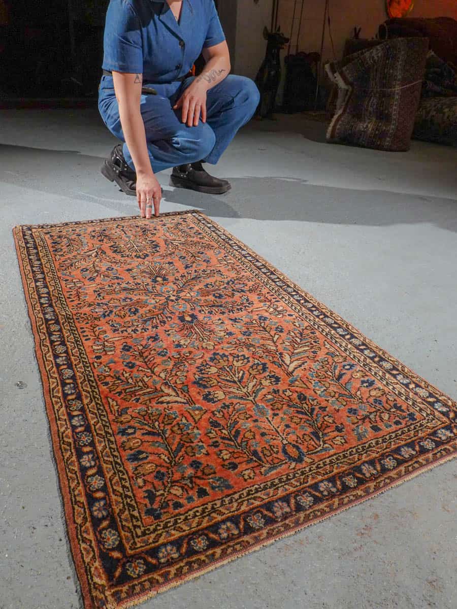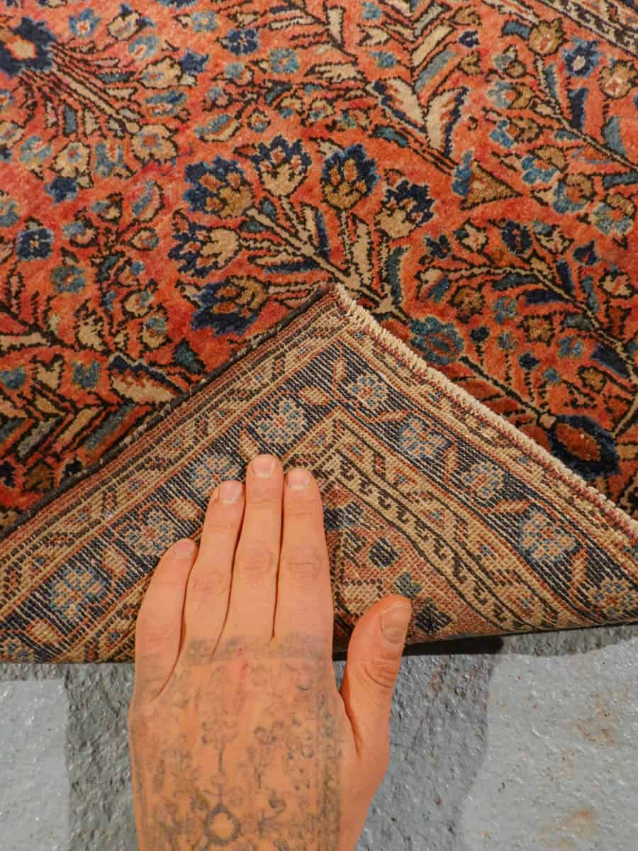 Uskomattoman kaunis antiikkinen Sarouk korallisella väripaletilla ja koristeellisella kuvioinnilla. Tyyli on niin sanottu US Sarouk, joita on valmistettu Persiassa 1920-luvulla Yhdysvaltojen markkinoille.
