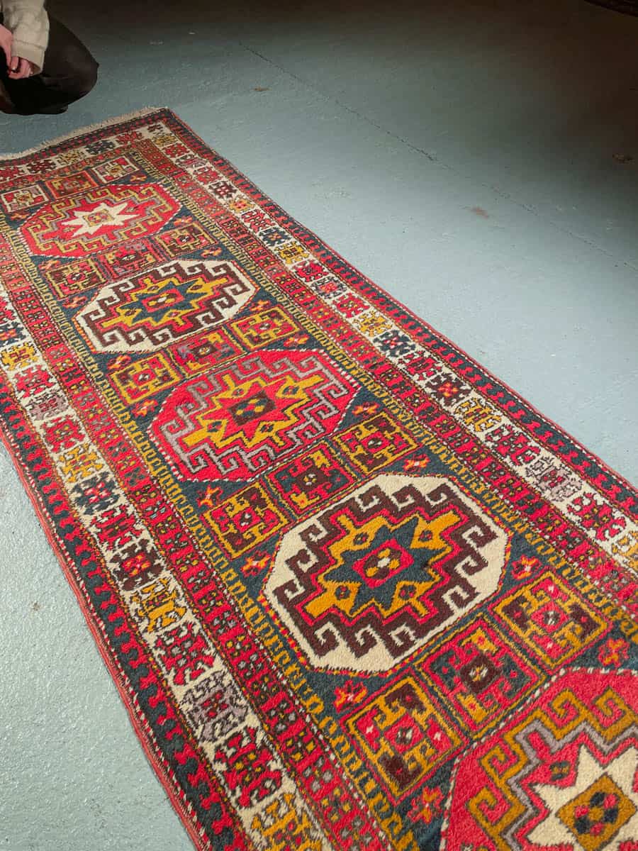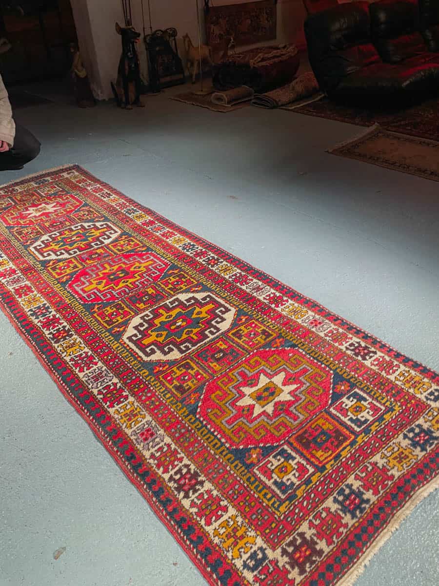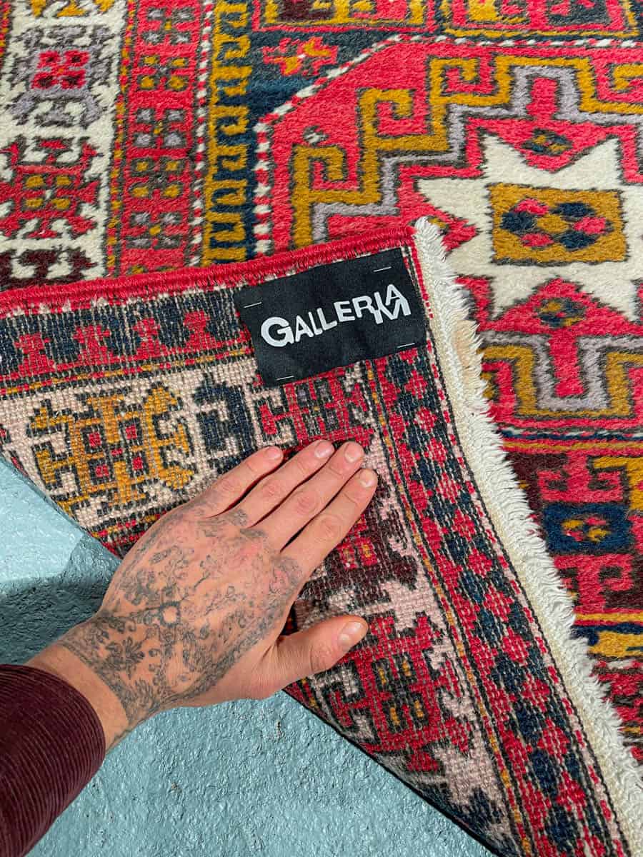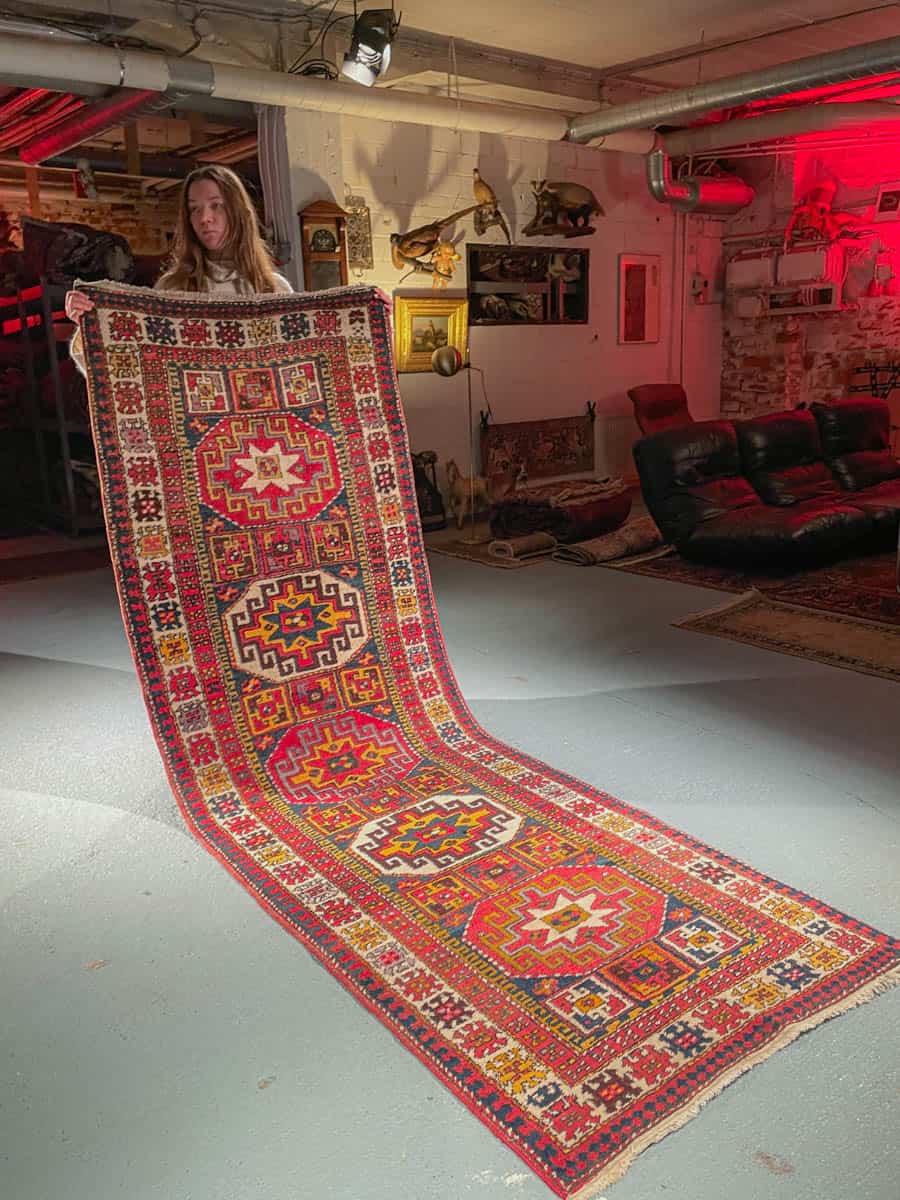 Tämä matto sijaitsee Galleriallamme osoitteessa Kankurinkatu 7, Punavuori – jos haluat tulla katsomaan sitä paikan päälle, sovithan näytön viestitse tai puhelimitse.