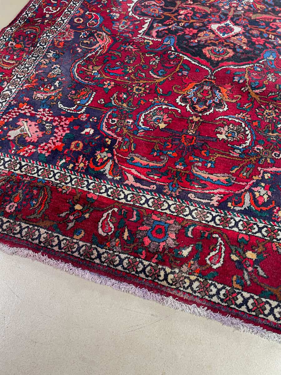 Tässä Iranissa n. 1960-luvulla villasta käsinsolmitussa Bahtijaarissa yhdistyy perinteikäs kuviointi tyrmäävällä keskimedaljongilla ja upeasti säilynyt harvinaislaatuinen verenpunaisen dramaattinen väriteema.