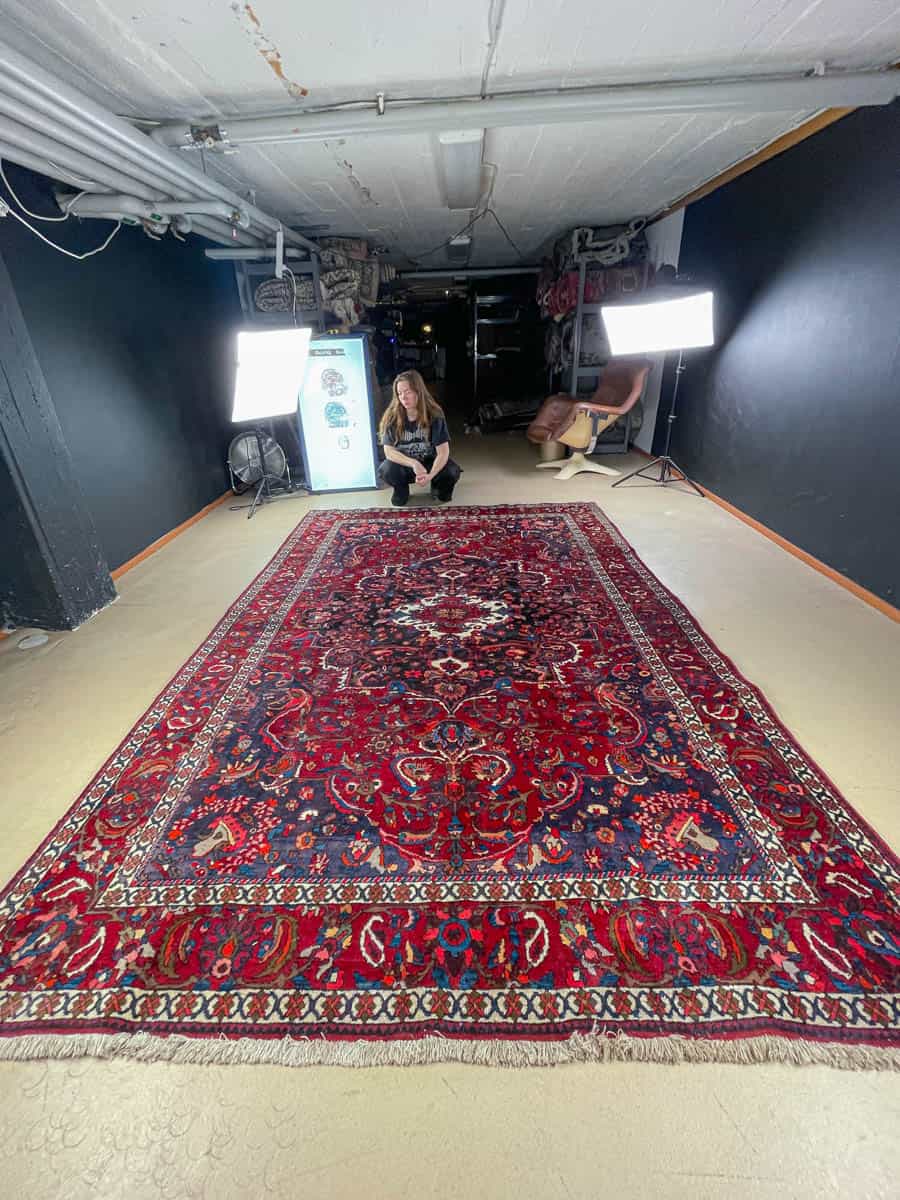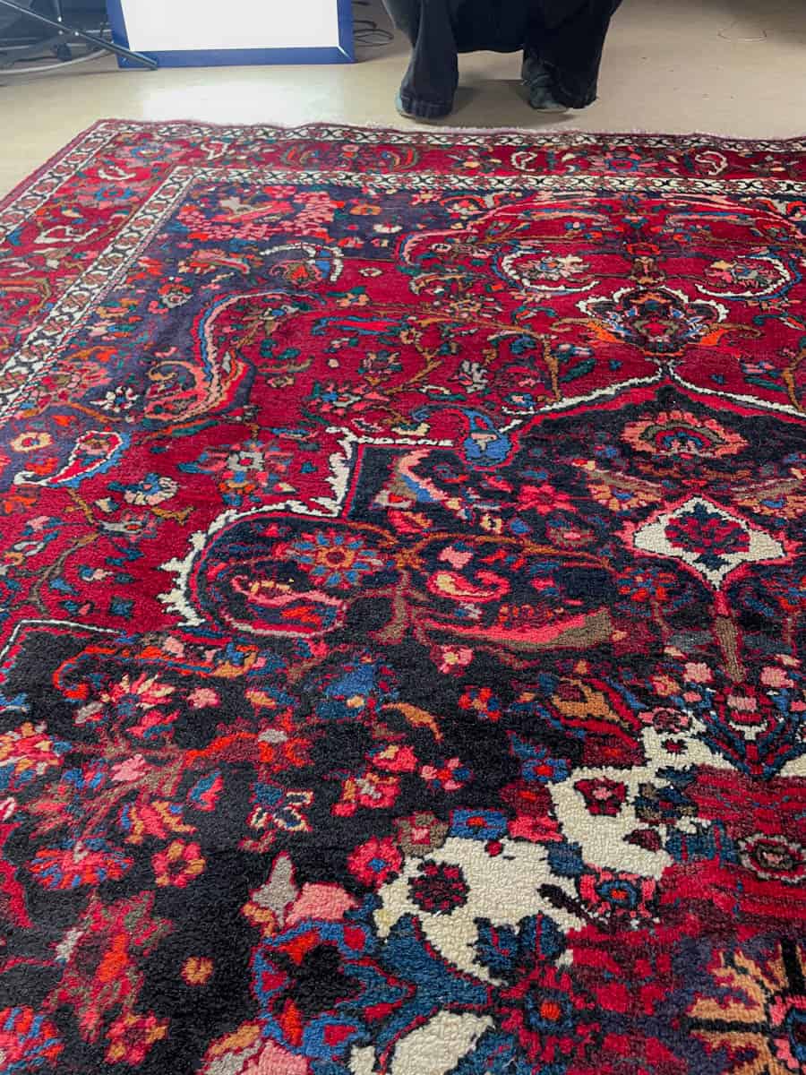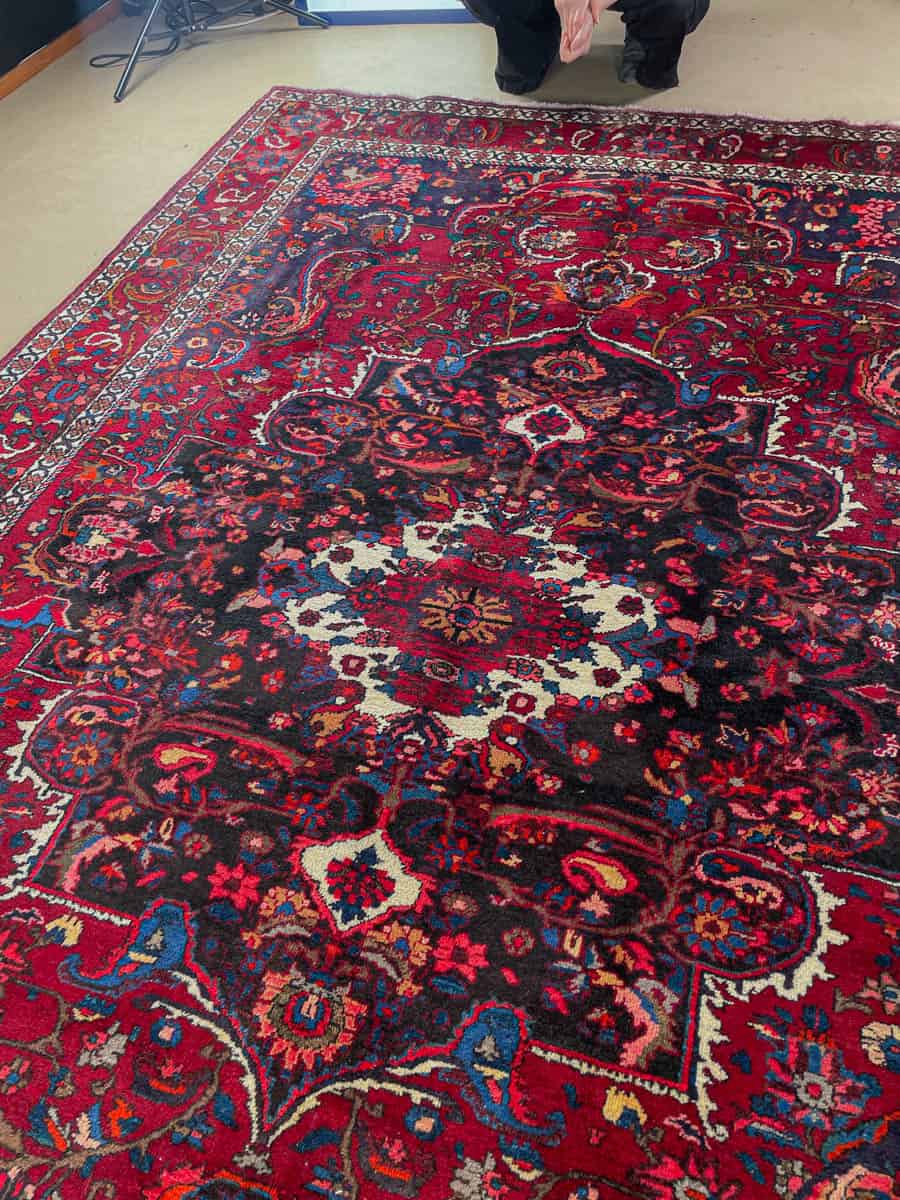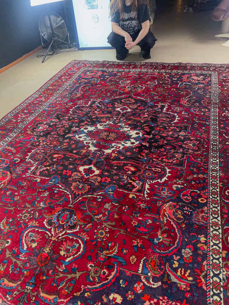 Tämä matto sijaitsee Töölön varastollamme – jos haluat tulla katsomaan sitä paikan päälle, sovithan näytön viestitse tai puhelimitse.