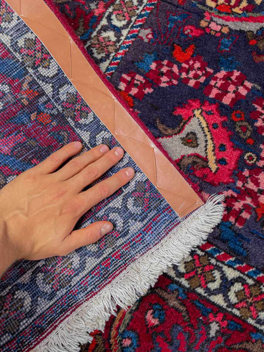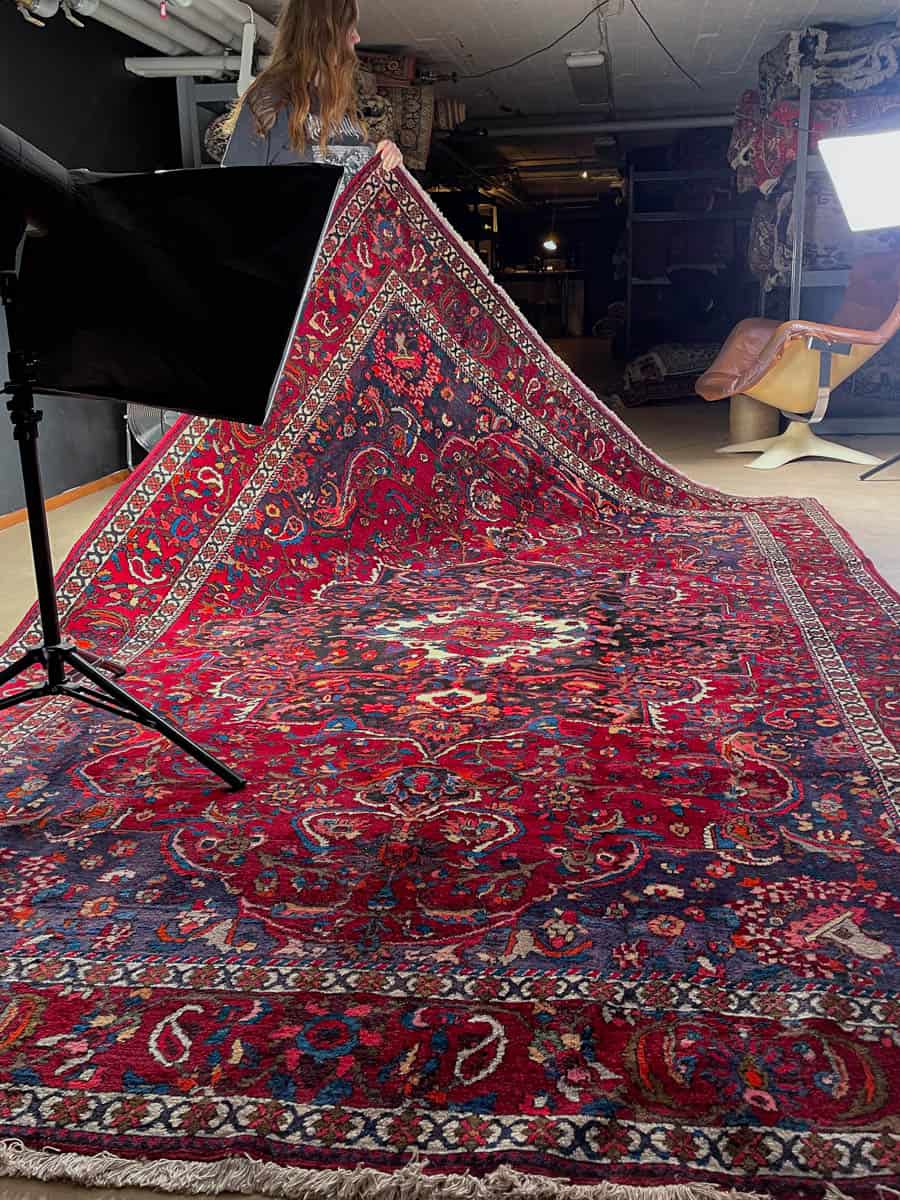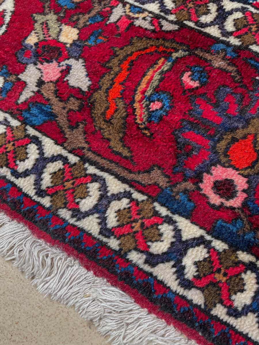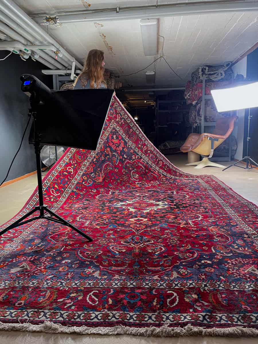 Tämä matto sijaitsee Töölön varastollamme – jos haluat tulla katsomaan sitä paikan päälle, sovithan näytön viestitse tai puhelimitse.