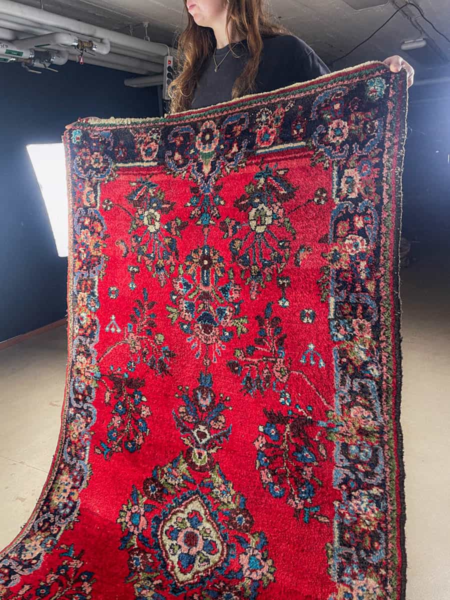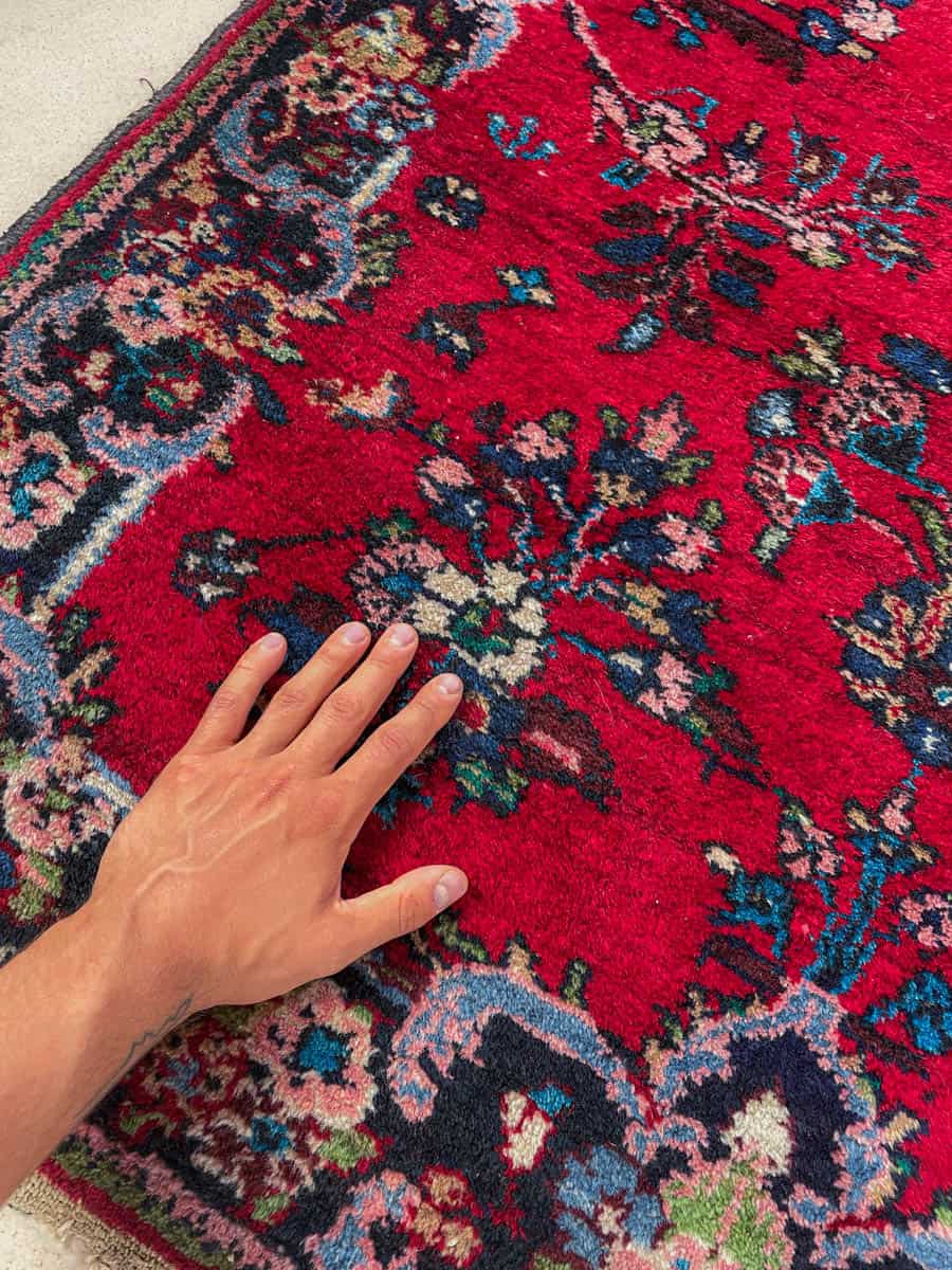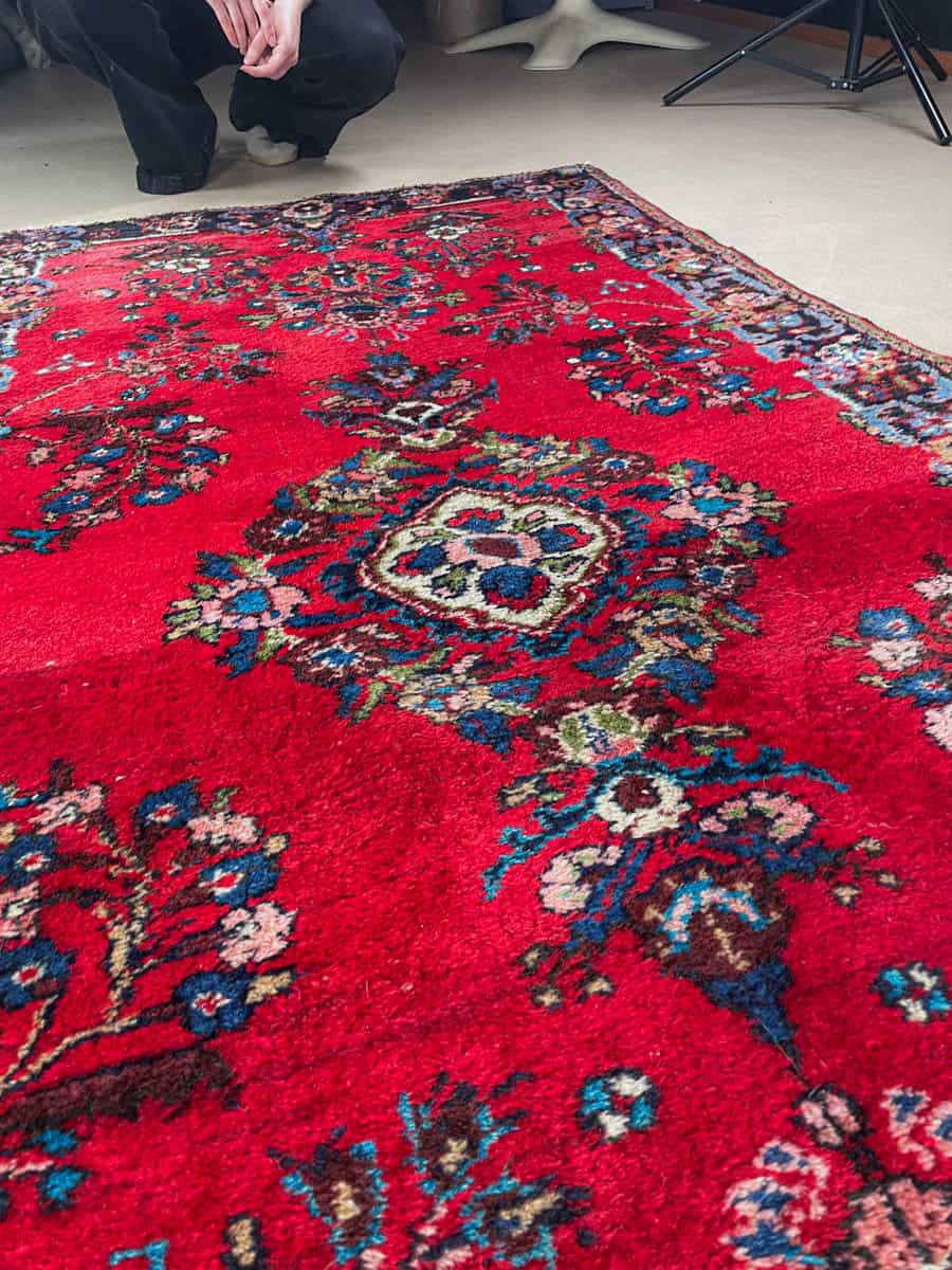 Perinteinen kukkakuvioitu Lilihan. Hienosti kirkkaana säilynyt punateemainen väritys. Laskeutuva paksun pehmeästä nukasta huolimatta.