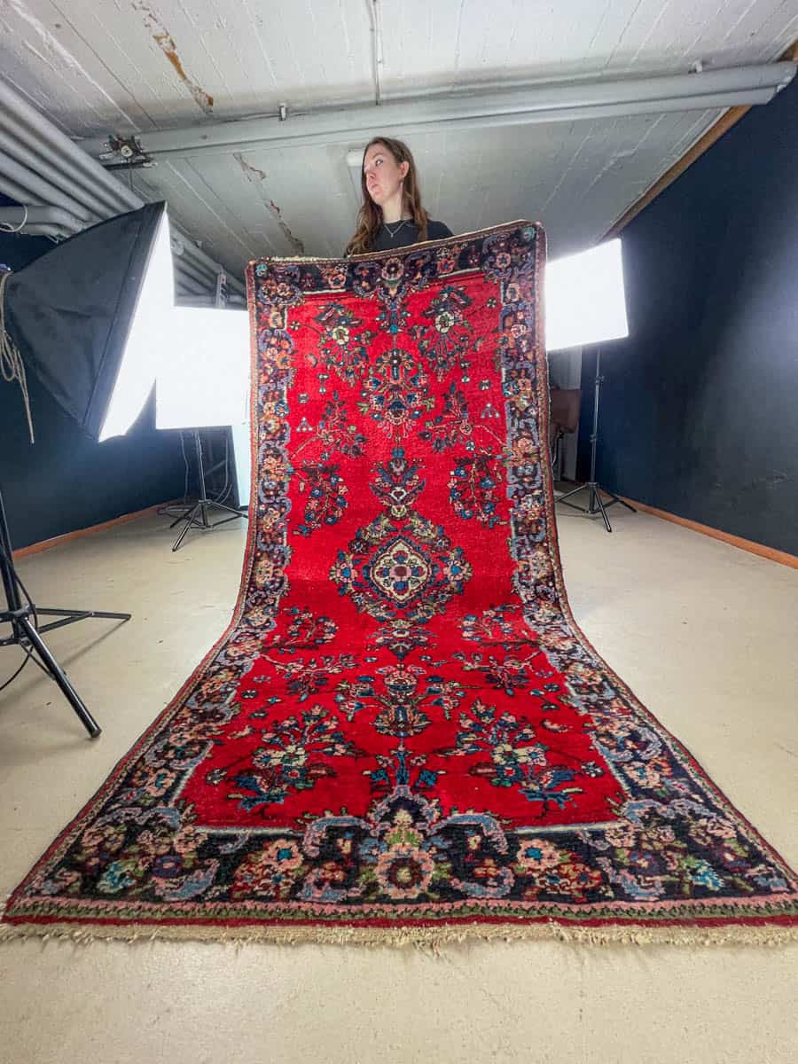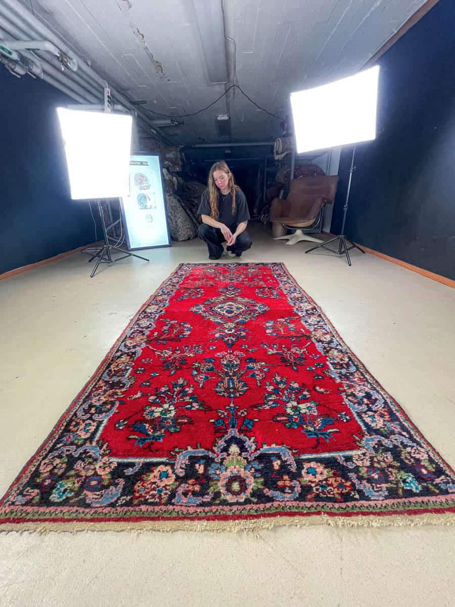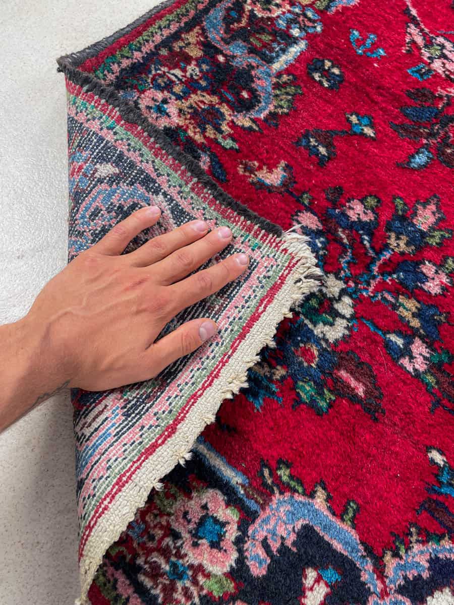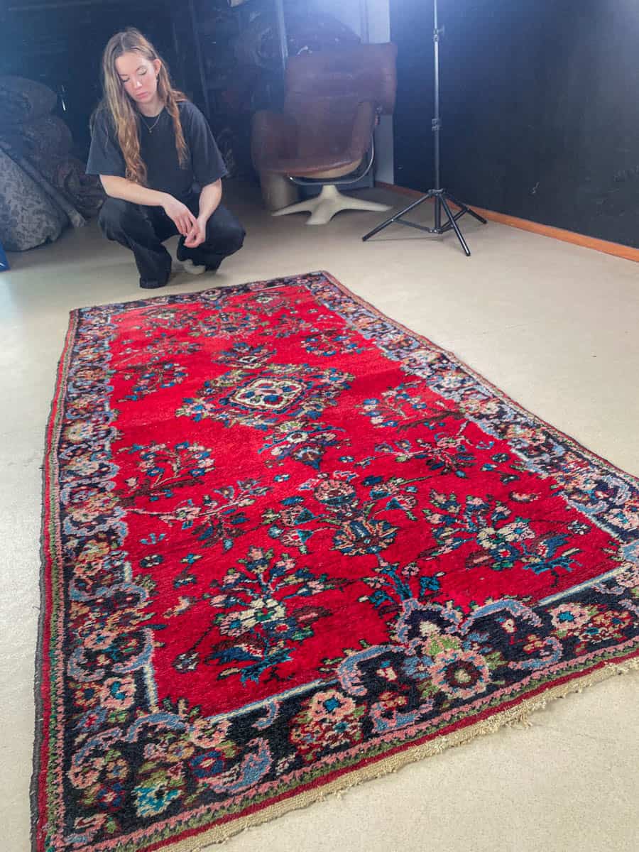 Perinteinen kukkakuvioitu Lilihan. Hienosti kirkkaana säilynyt punateemainen väritys. Laskeutuva paksun pehmeästä nukasta huolimatta.