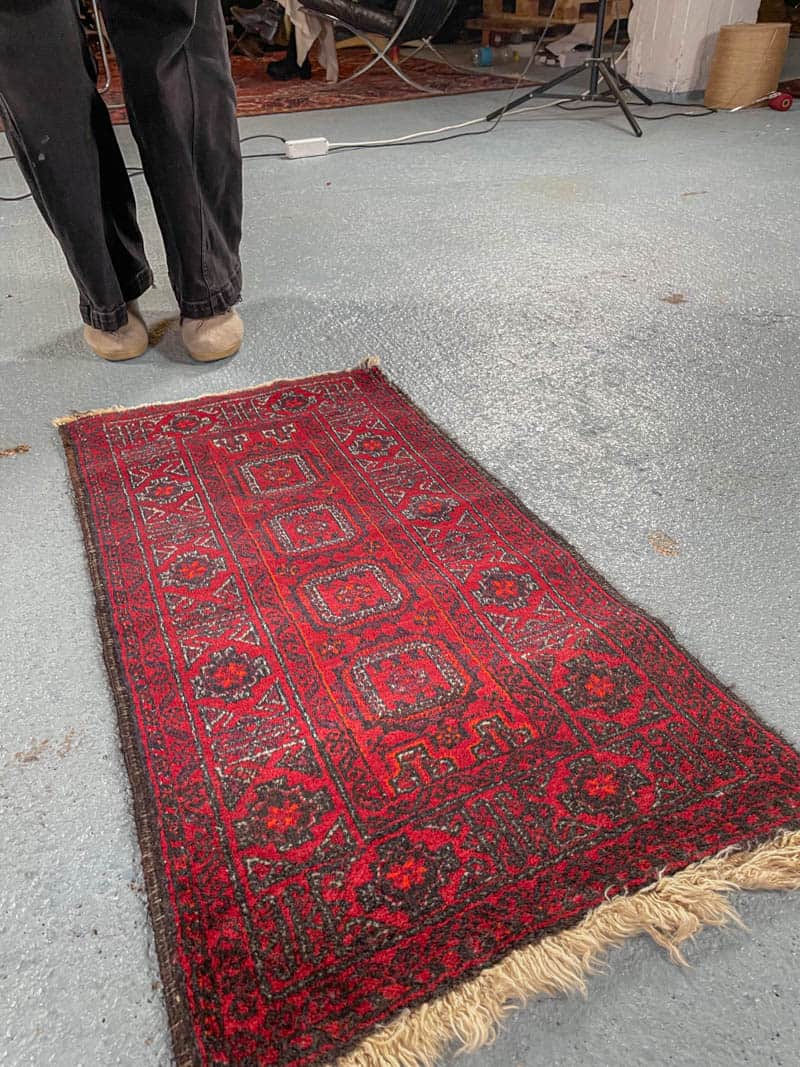 Kauniin punainen afgaanimatto yksityiskohtaisella kuvioinnilla. Käsinsolmittu villasta villaloimelle.