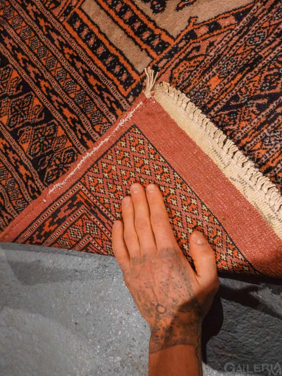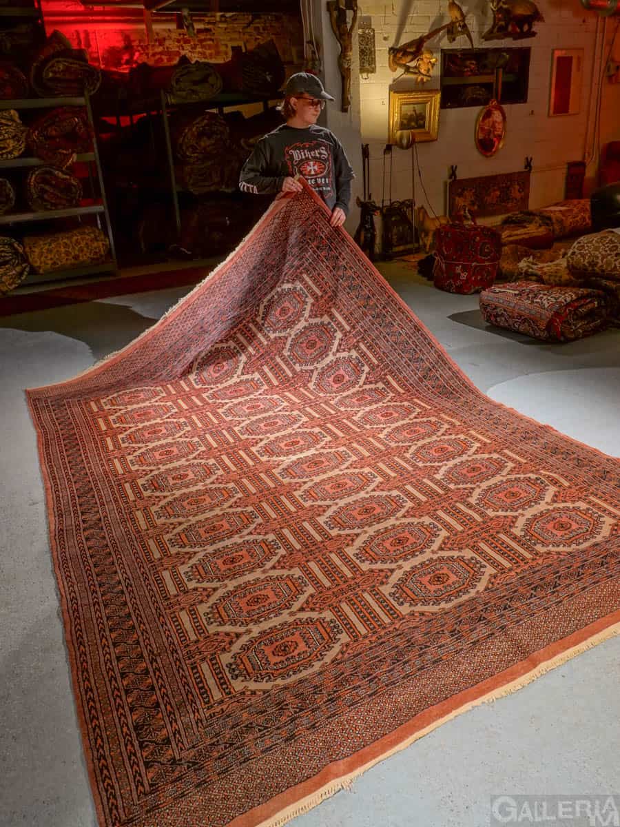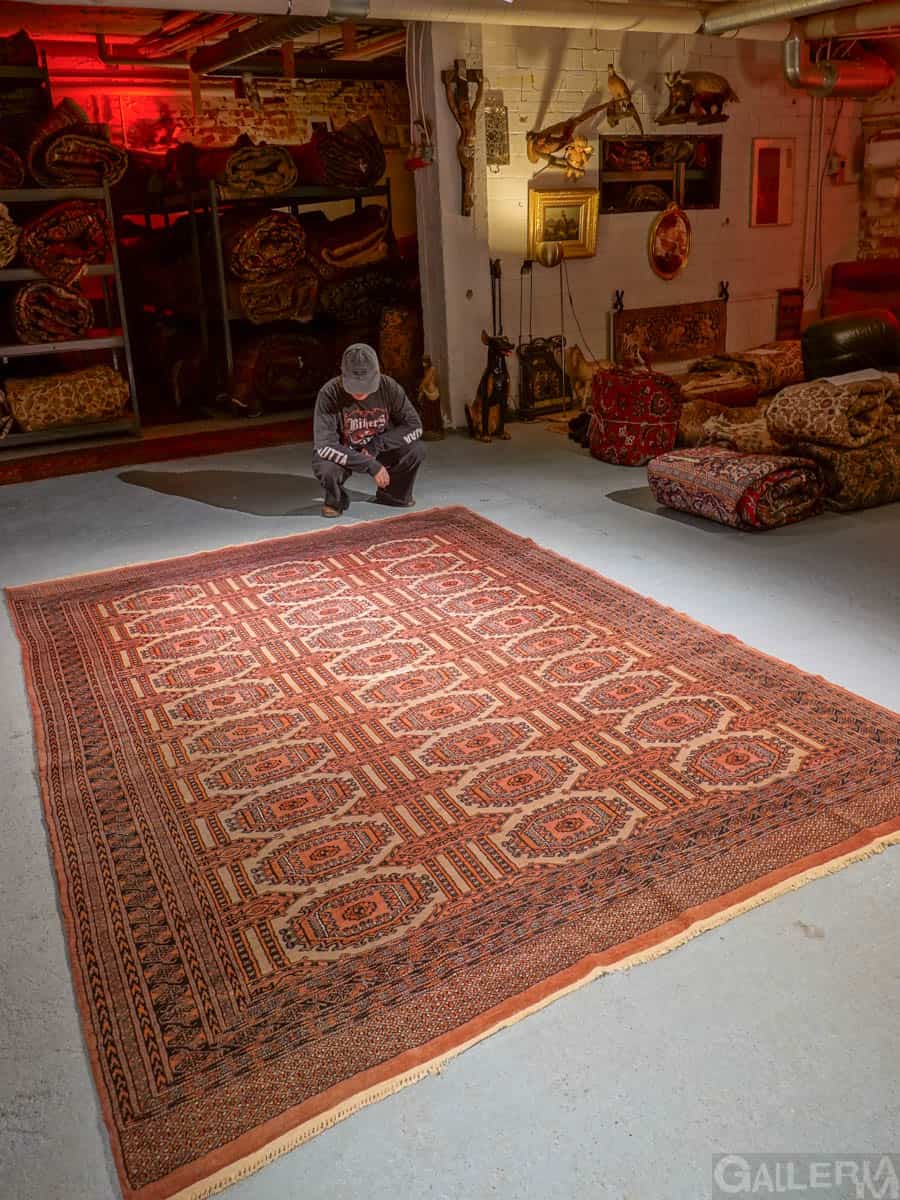 Käsinsolmittu villasta perinteiseen persialaiseen Buhara-tyyliin. Upea maanläheinen väripaletti.