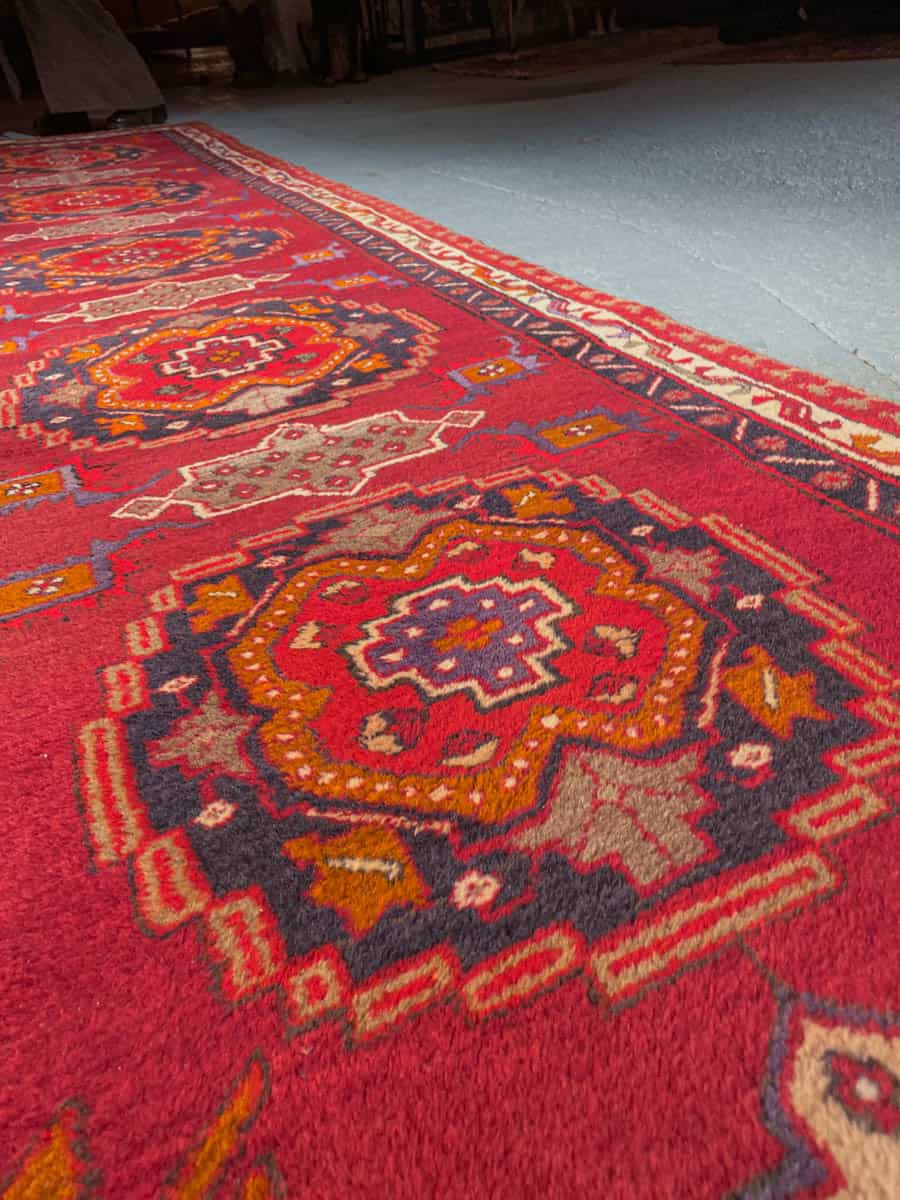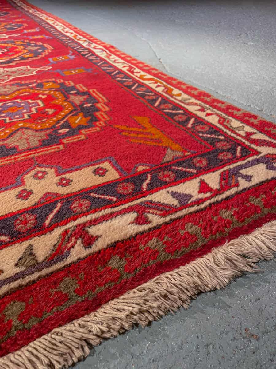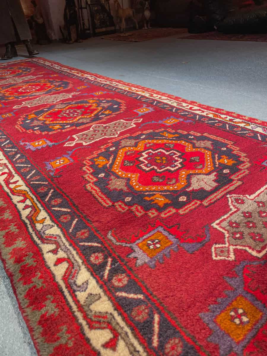 Pramea Sarab-käytävämatto geometrisellä kuvioinnilla ja punaisella väriteemalla. Käsinsolmittu villasta n. 60 vuotta sitten.